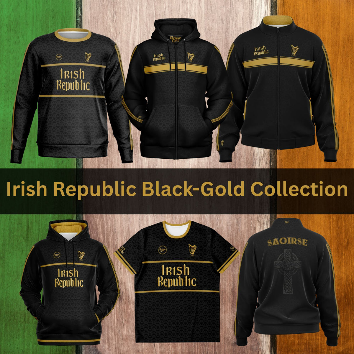 The New Limited Edition Irish Republic Black-Gold Collection celebrates Ireland’s past with a modern edge. Black Celtic knot detail, gold Celtic knot styled stripes, and the Irish harp – timeless pride, built for today’s generation.