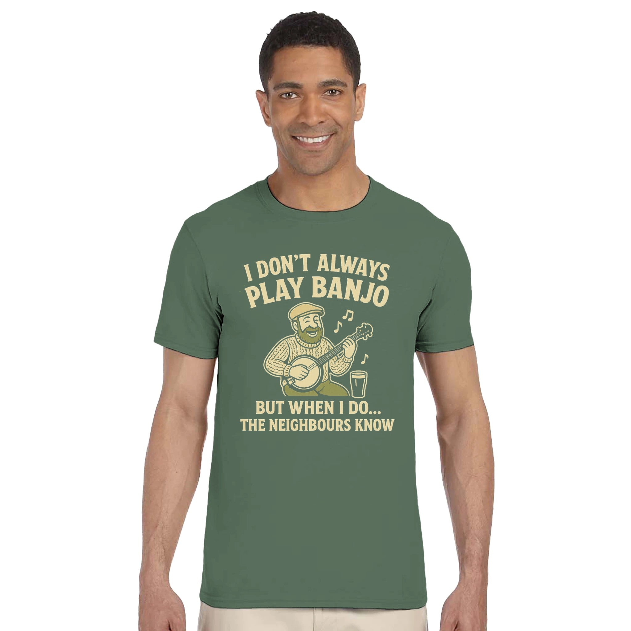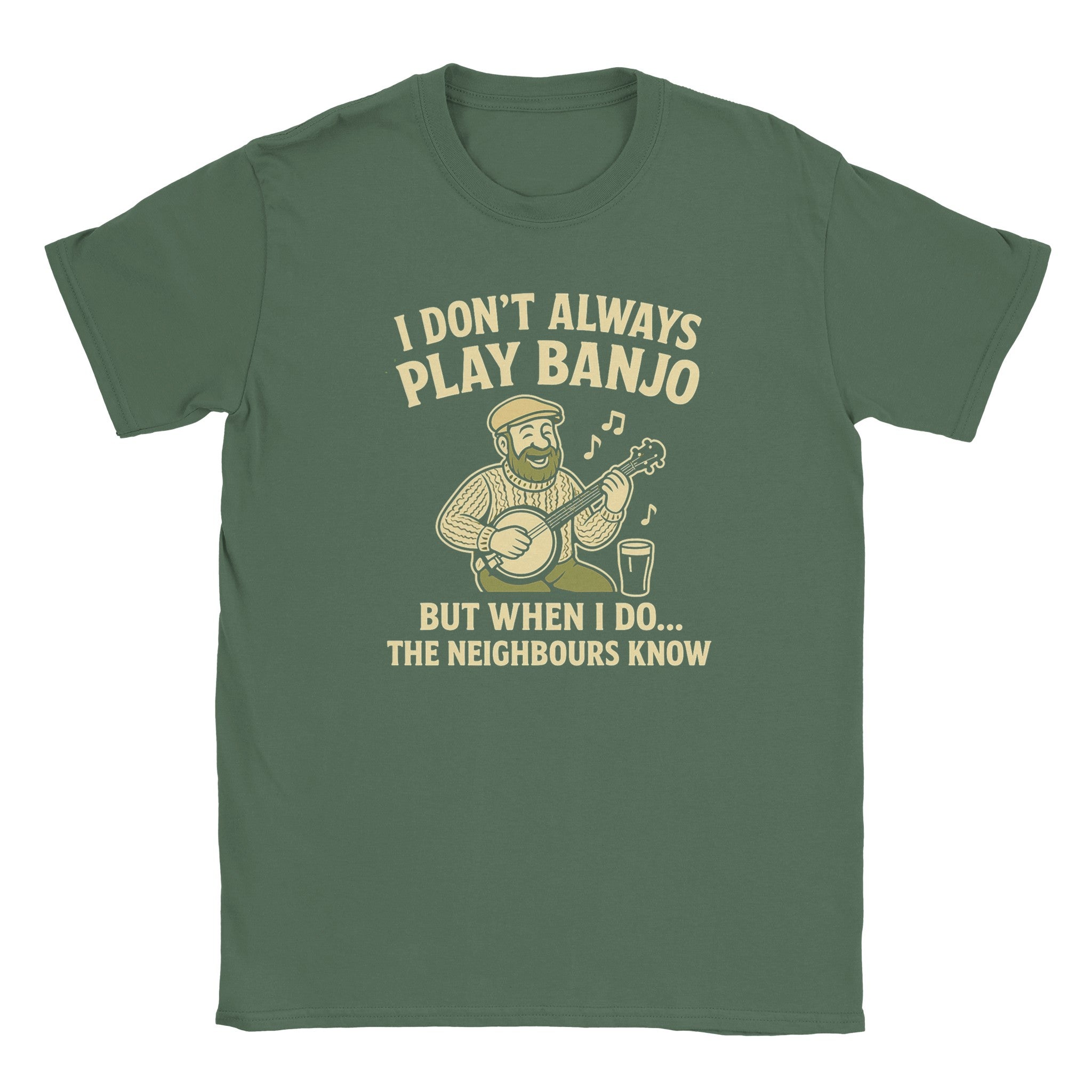 Bring the craic to any trad session with this funny Irish banjo t-shirt featuring a grinning Irish man in an Aran sweater and flat cap, pint of Guinness by his side, and the text “I Don’t Always Play Banjo… But When I Do, The Neighbours Know.” Perfect for Irish musicians and festival goers.