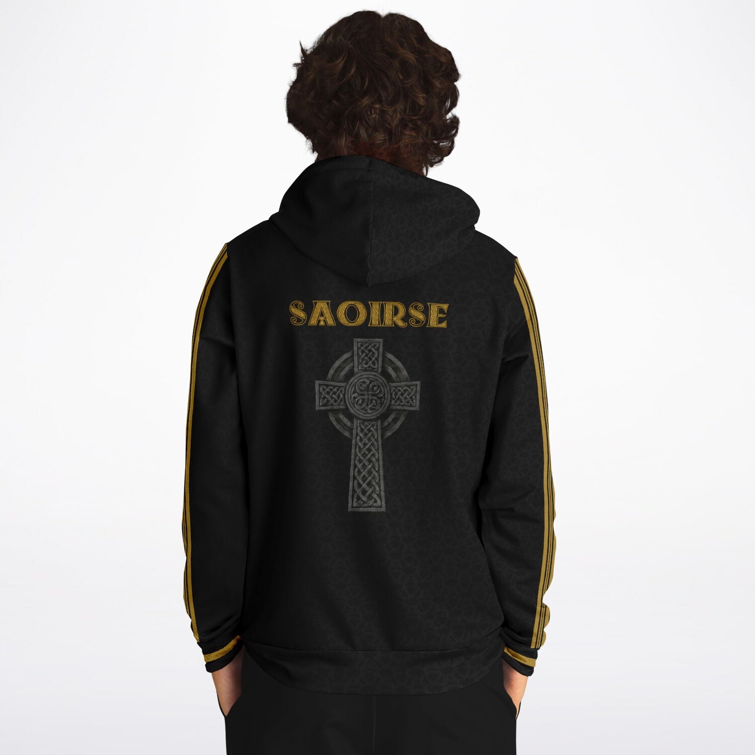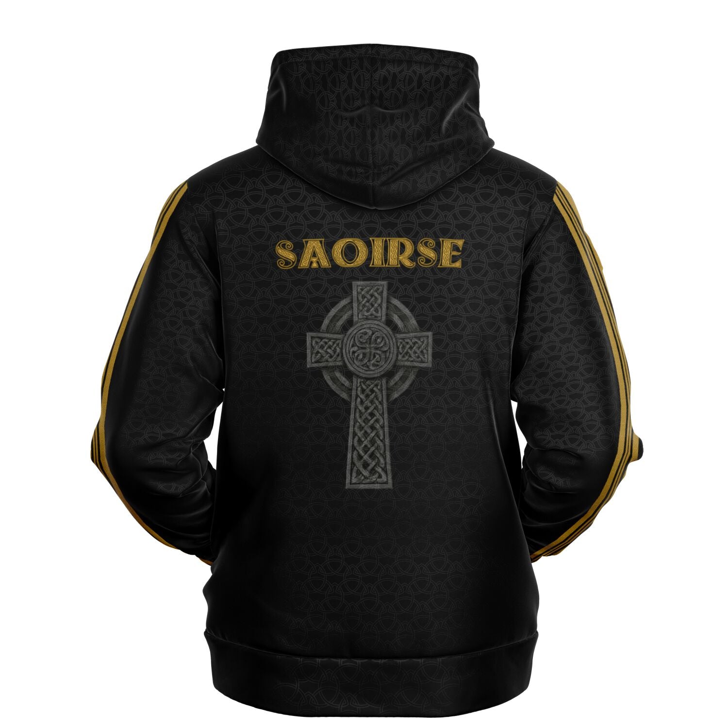 Wrap yourself in Irish pride with the Irish Republic Black-Gold Edition Hoodie. Featuring a bold black Celtic knot design, gold Celtic knot styled stripes, the Irish harp, Saoirse and a Celtic cross on the back, this unique custom designed hoodie blends heritage and style. Inspired by the 1916 Easter Rising flag – rebel spirit meets modern comfort.