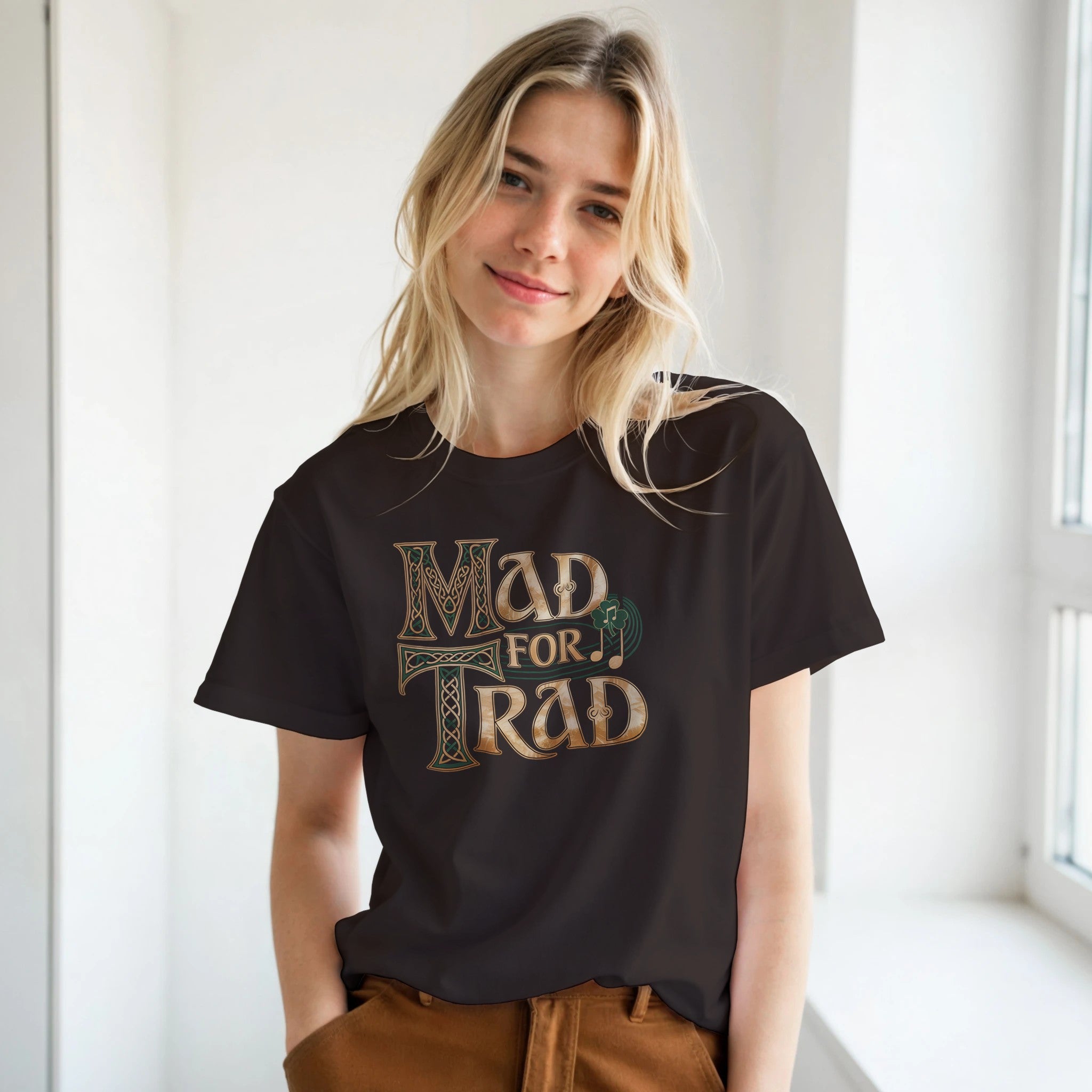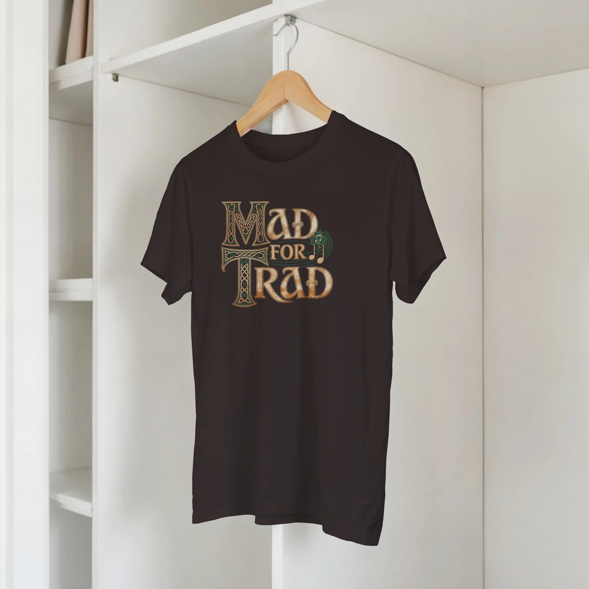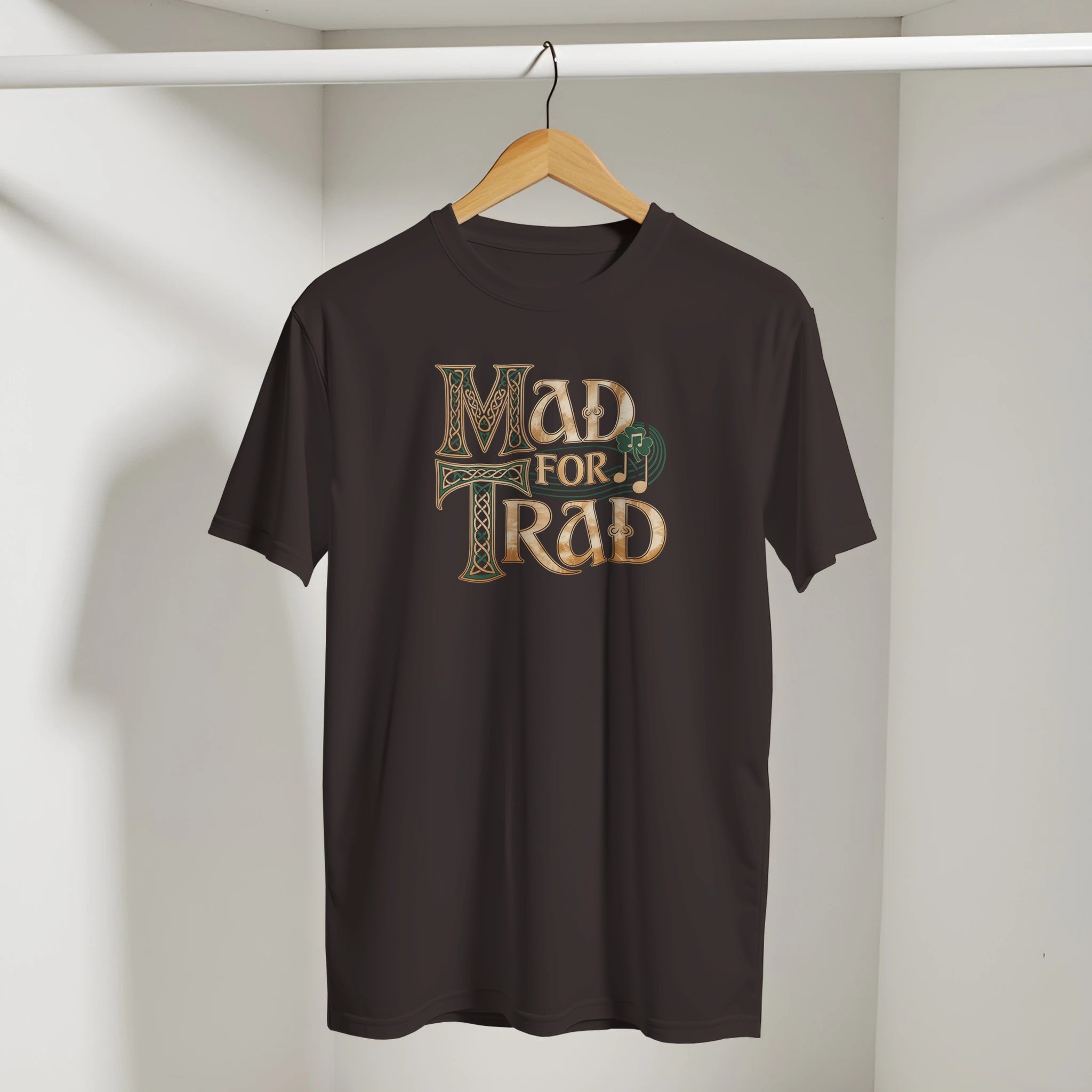 Show off your passion for Irish trad music with the Mad for Trad Irish Music T-shirt. Featuring intricate Book of Kells-inspired knotwork and medieval Irish lettering, this playful design is perfect for sessions, festivals, or simply celebrating your Irish roots in style. Wear your love for trad loud and proud!