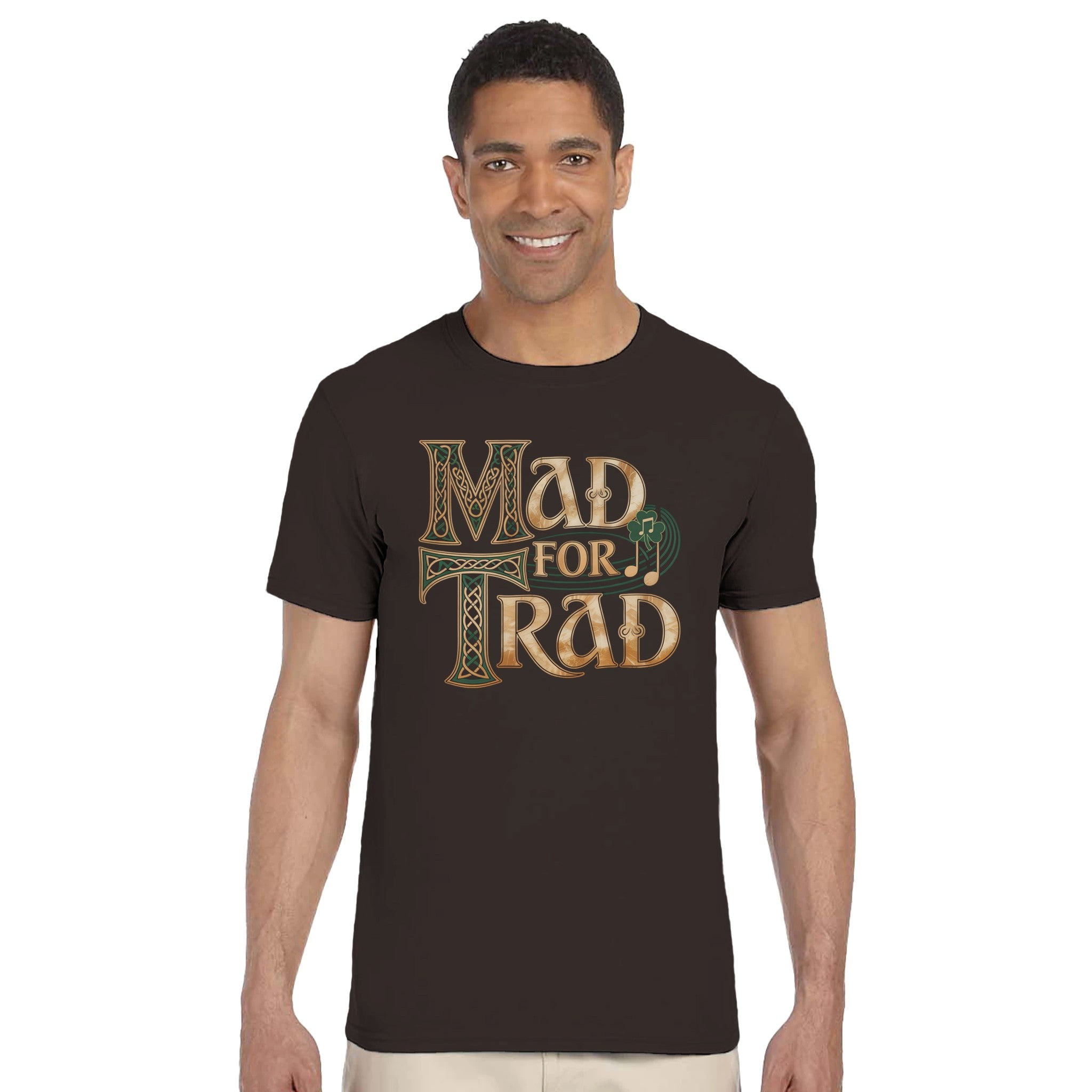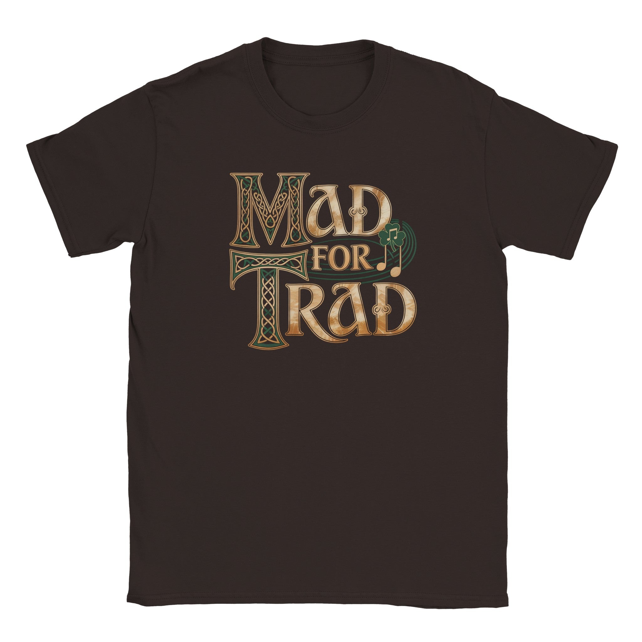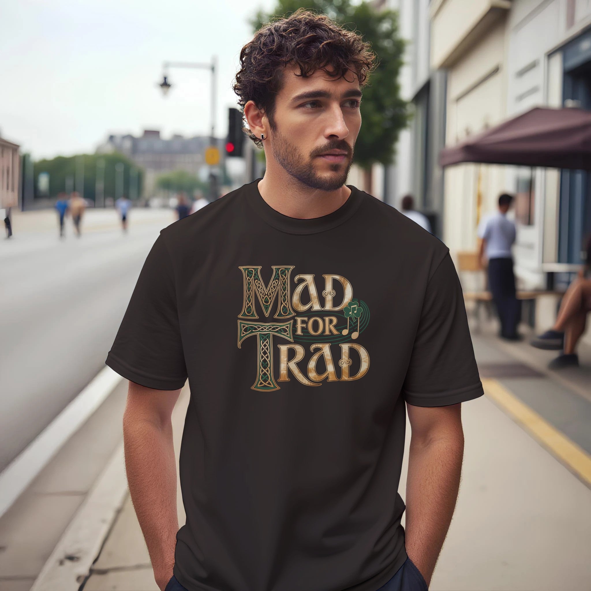 Show off your passion for Irish trad music with the Mad for Trad Irish Music T-shirt. Featuring intricate Book of Kells-inspired knotwork and medieval Irish lettering, this playful design is perfect for sessions, festivals, or simply celebrating your Irish roots in style. Wear your love for trad loud and proud!