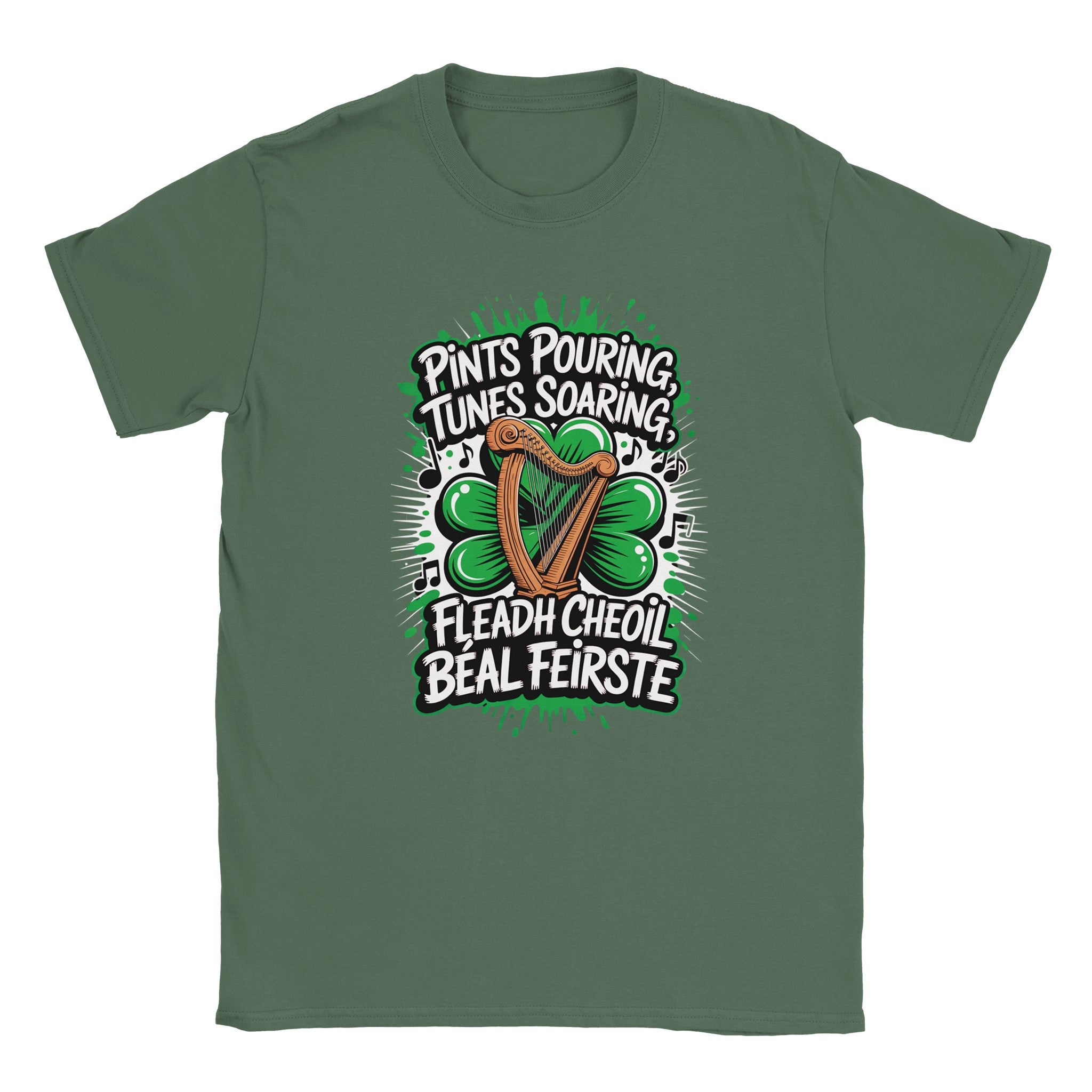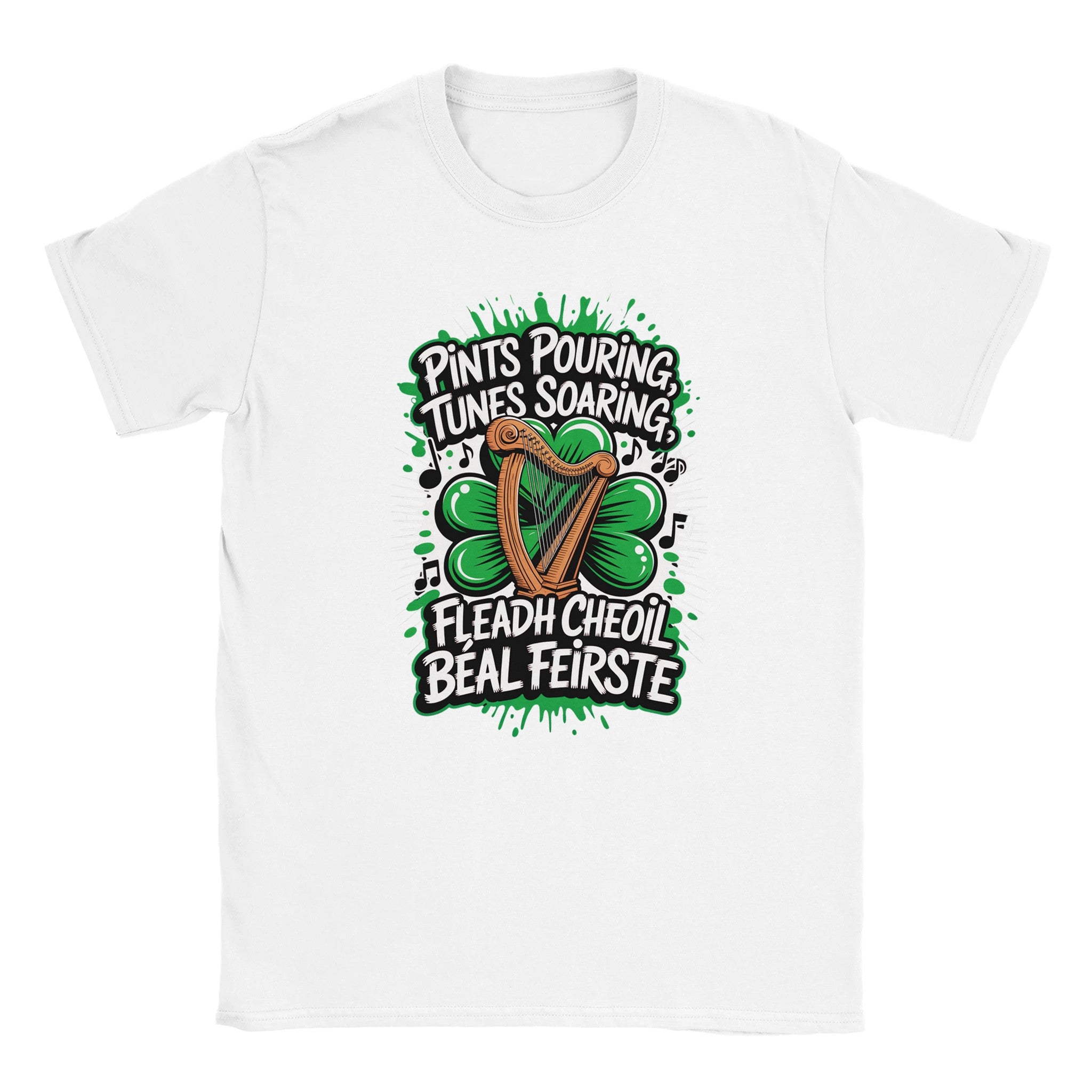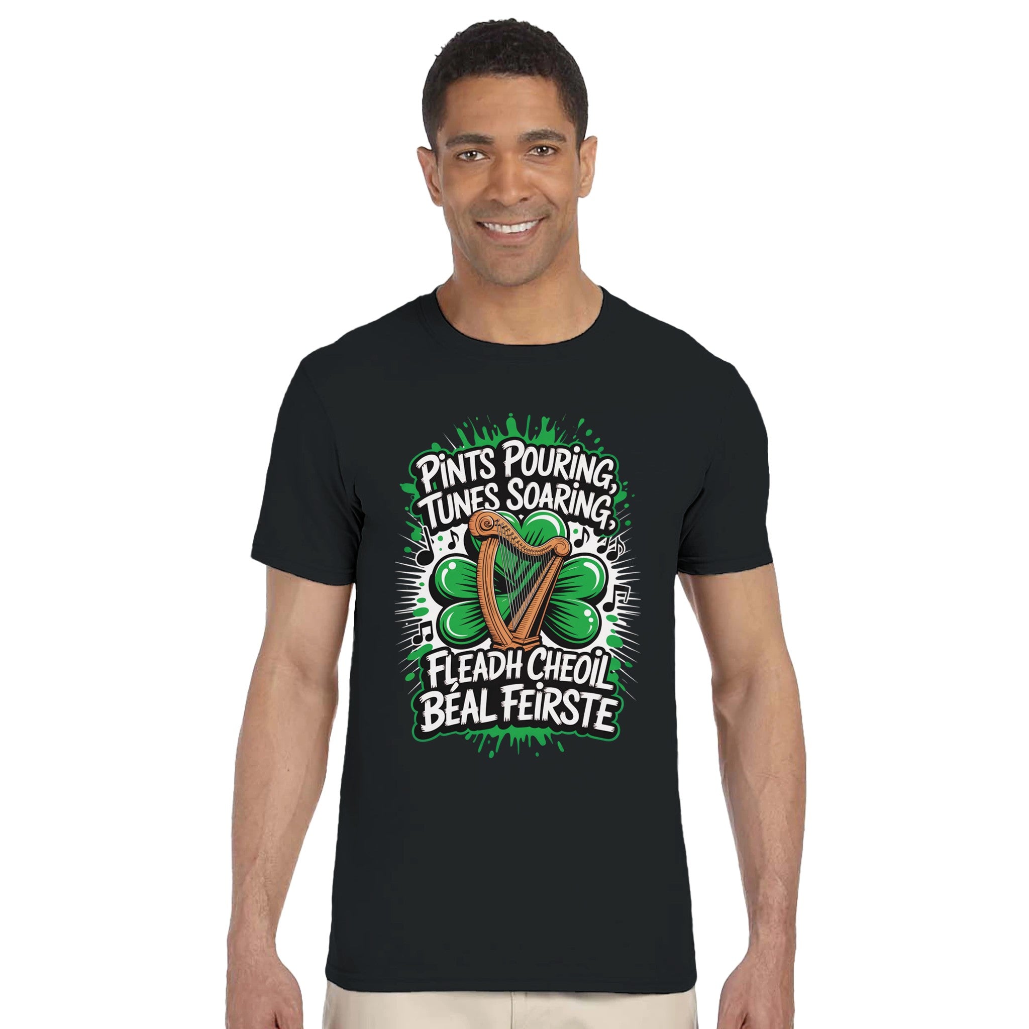 Celebrate the biggest Irish music festival in the world with our Fleadh Cheoil Béal Feirste t-shirt! Featuring a bold graffiti-style design with the slogan “Pints pouring, tunes soaring,” this shirt is perfect for festival goers, trad musicians, and anyone with Irish pride.