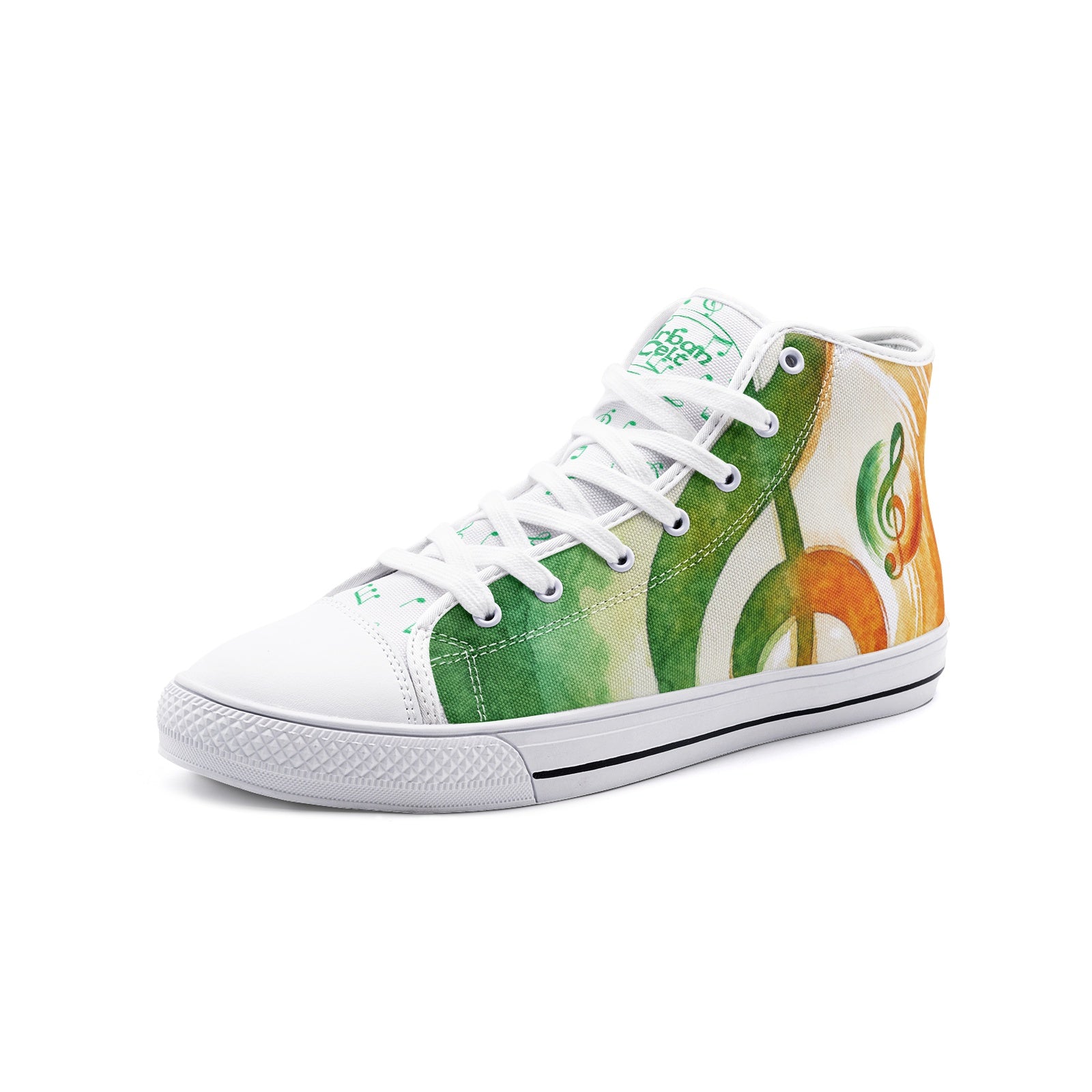 Show your love for Irish music with these Tricolour Treble Clef High Top canvas shoes. Featuring a vibrant watercolor design in green, white, and orange, this Celtic-inspired design celebrates Ireland’s musical soul — perfect for musicians, trad fans, and lovers of Irish culture.