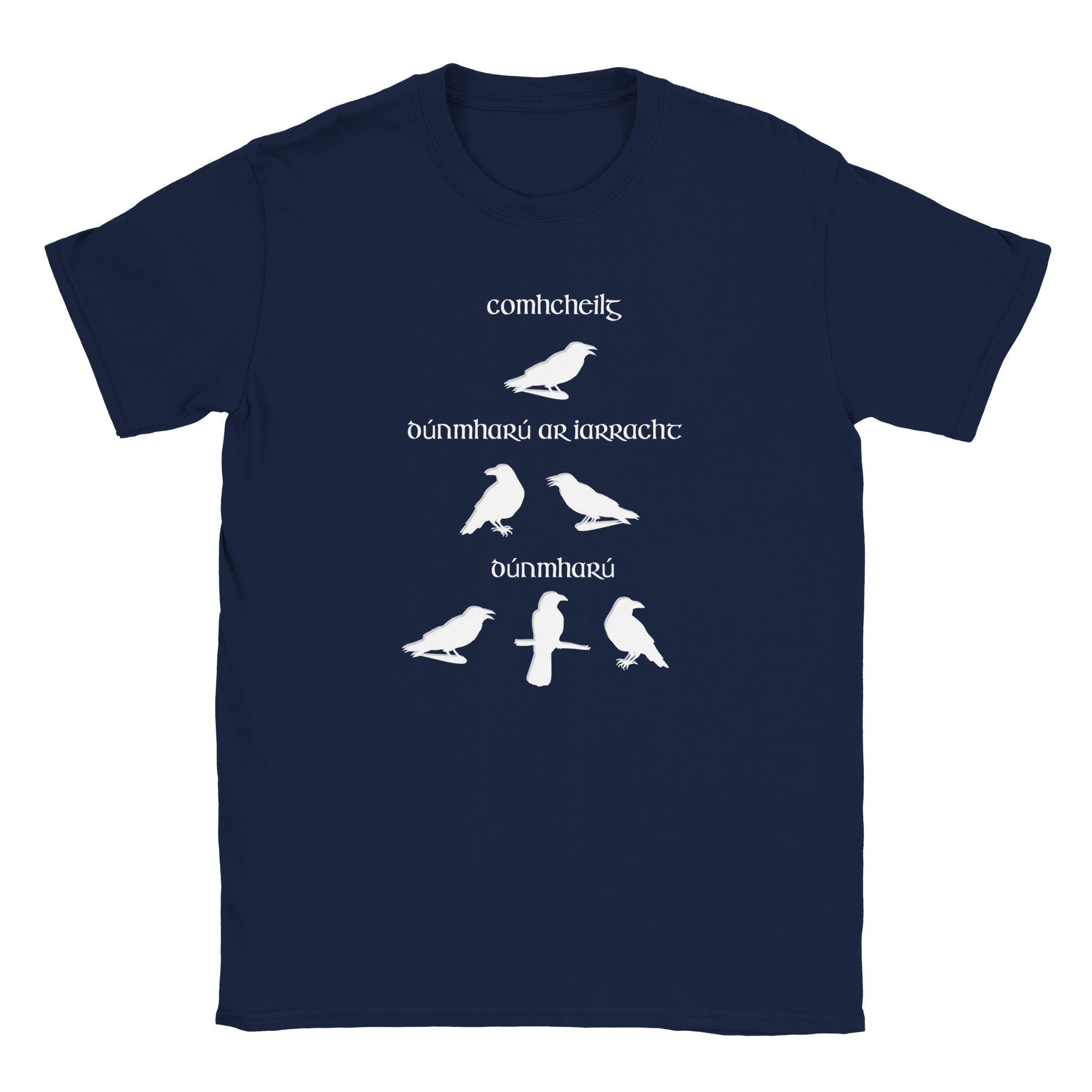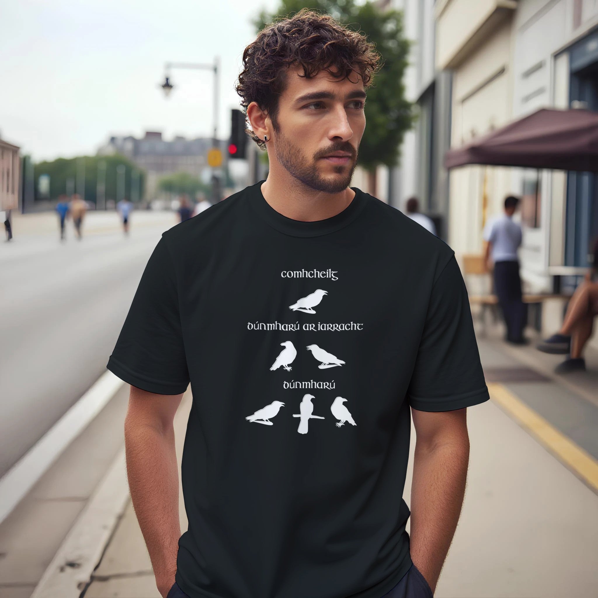 This Irish crow-crime t-shirt is a perfect blend of Gaeilge humour and dark, cheeky wit. Featuring three phrases — “comhcheilg” (conspiracy), “dúnmharú ar iarracht” (attempted murder), and “dúnmharú” (murder) — this design cleverly pairs each term with silhouettes of crows, creating a visual pun that any fan of Irish culture will instantly recognise.