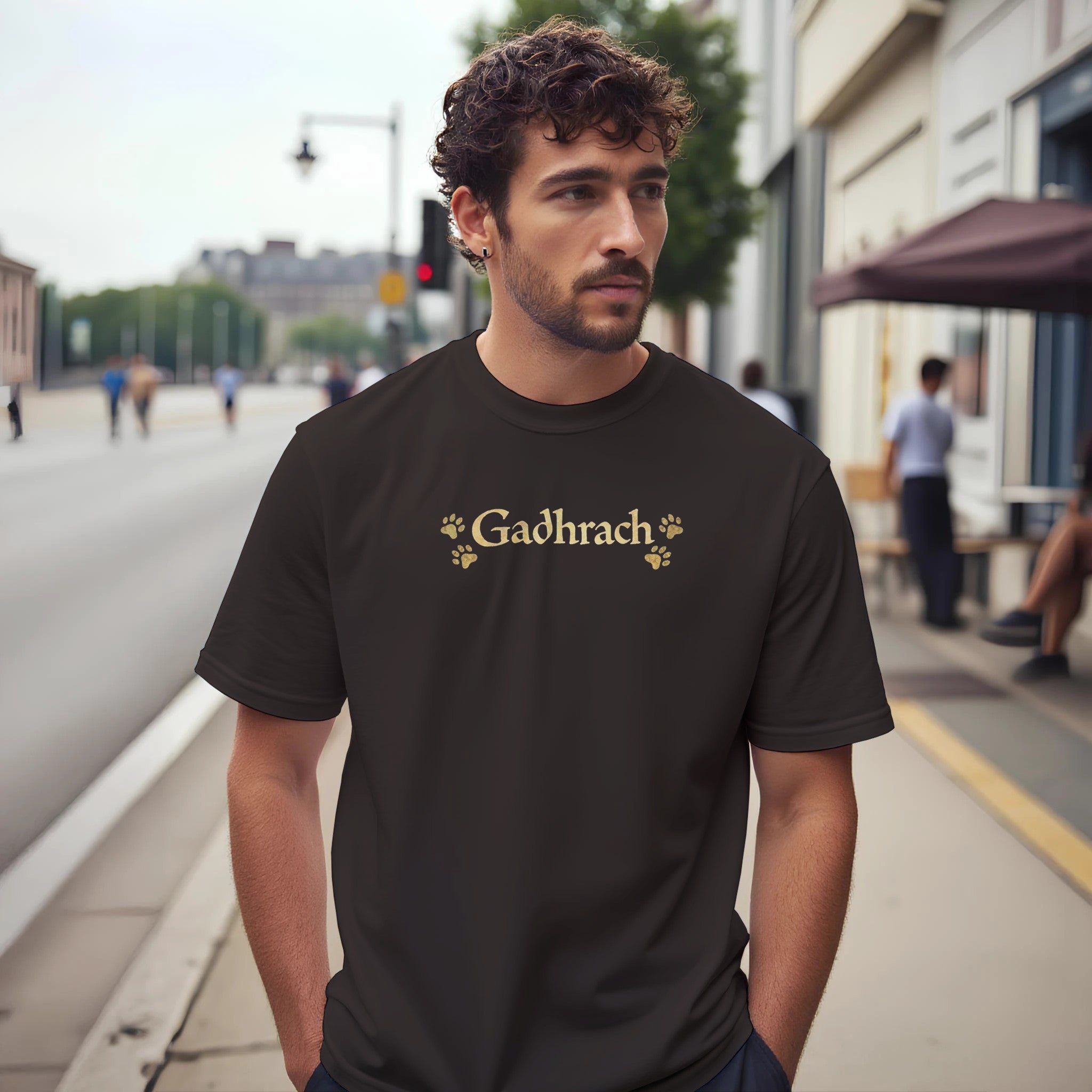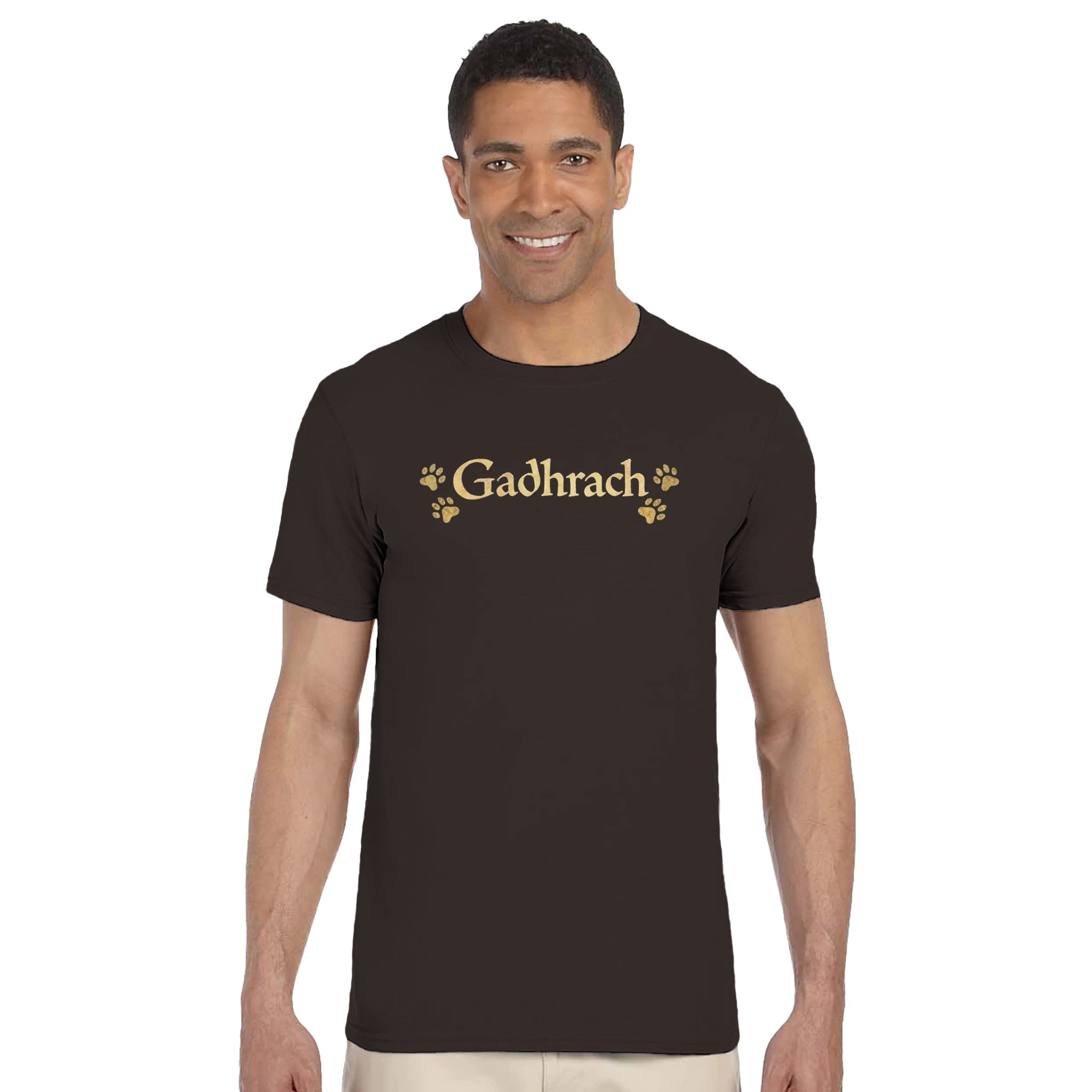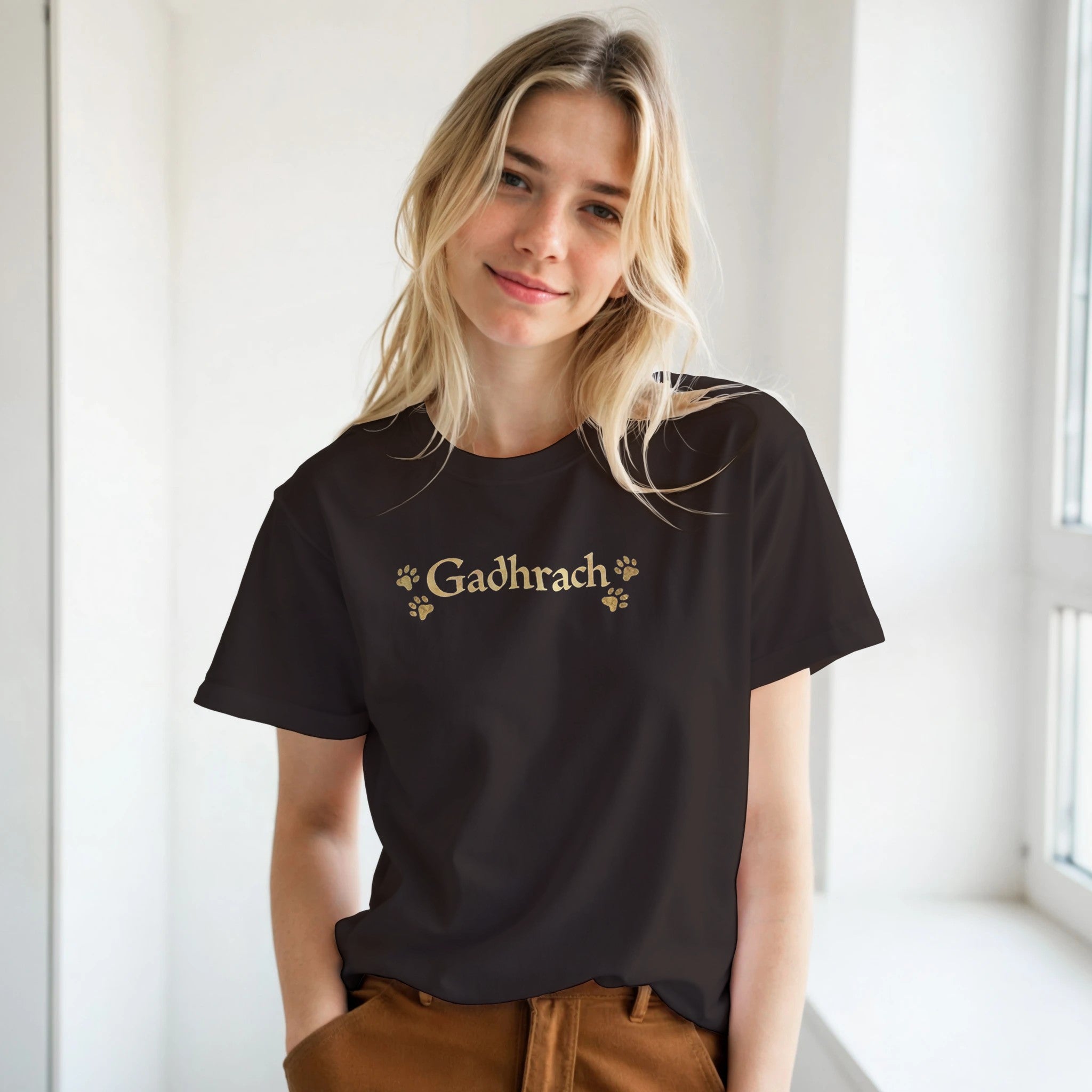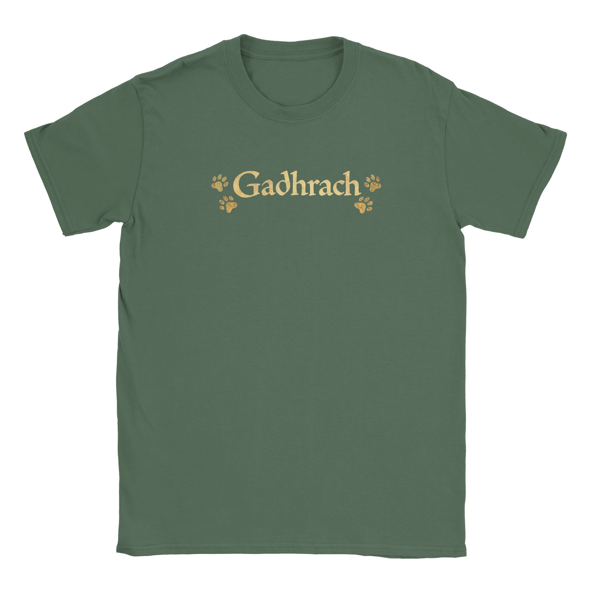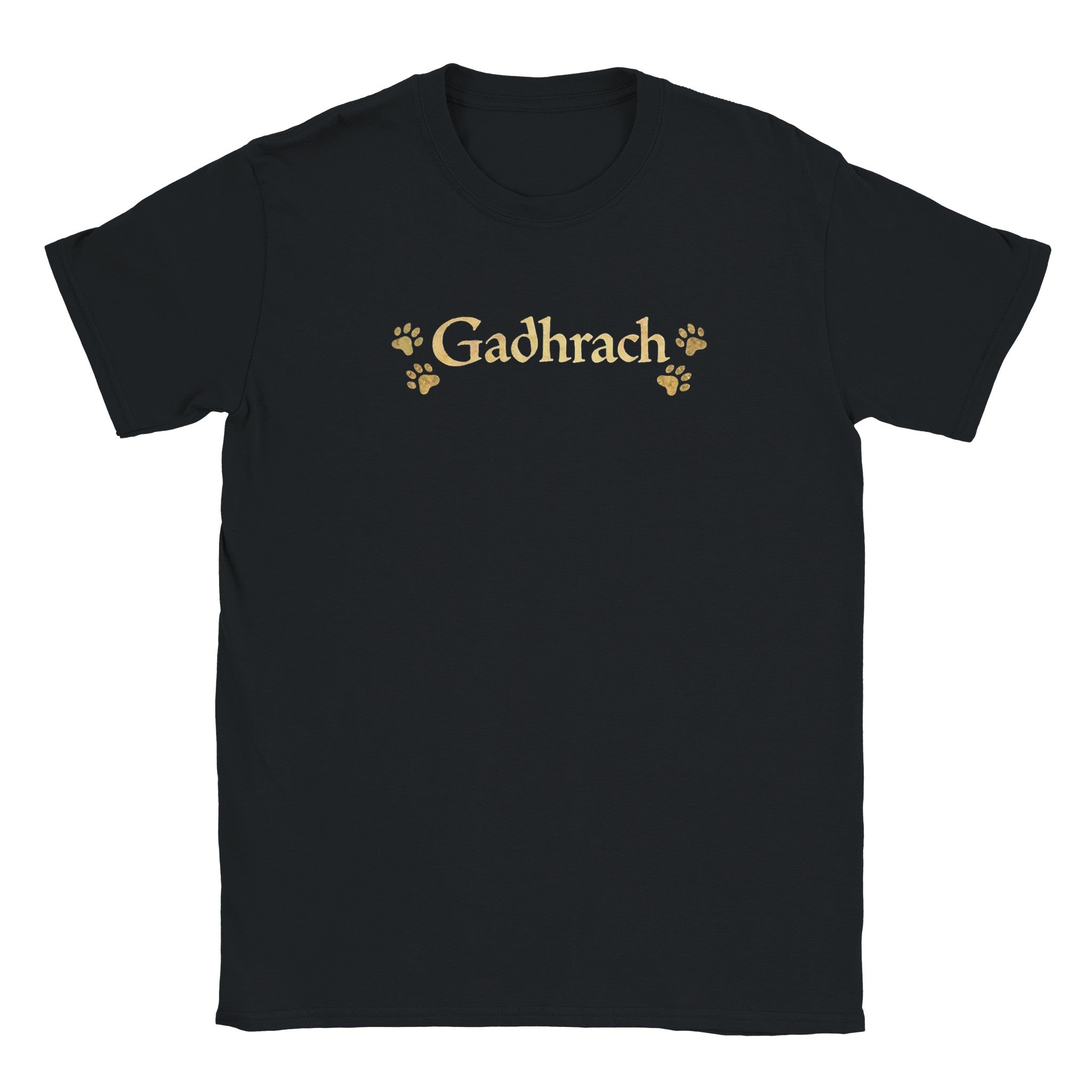 Gadhrach is an old Irish word meaning Fond of Dogs or Abounding in Dogs. This minimalist unisex cottont-shirt features bold Gaelic lettering with subtle paw prints, creating a clean, modern design for dog lovers who appreciate Irish language and heritage.