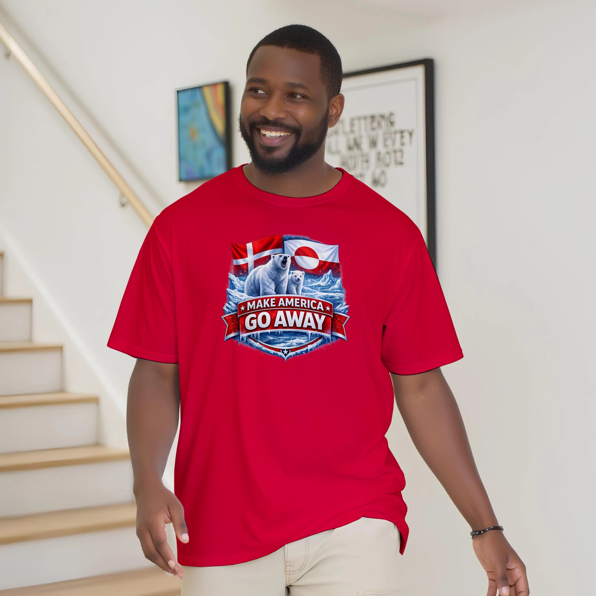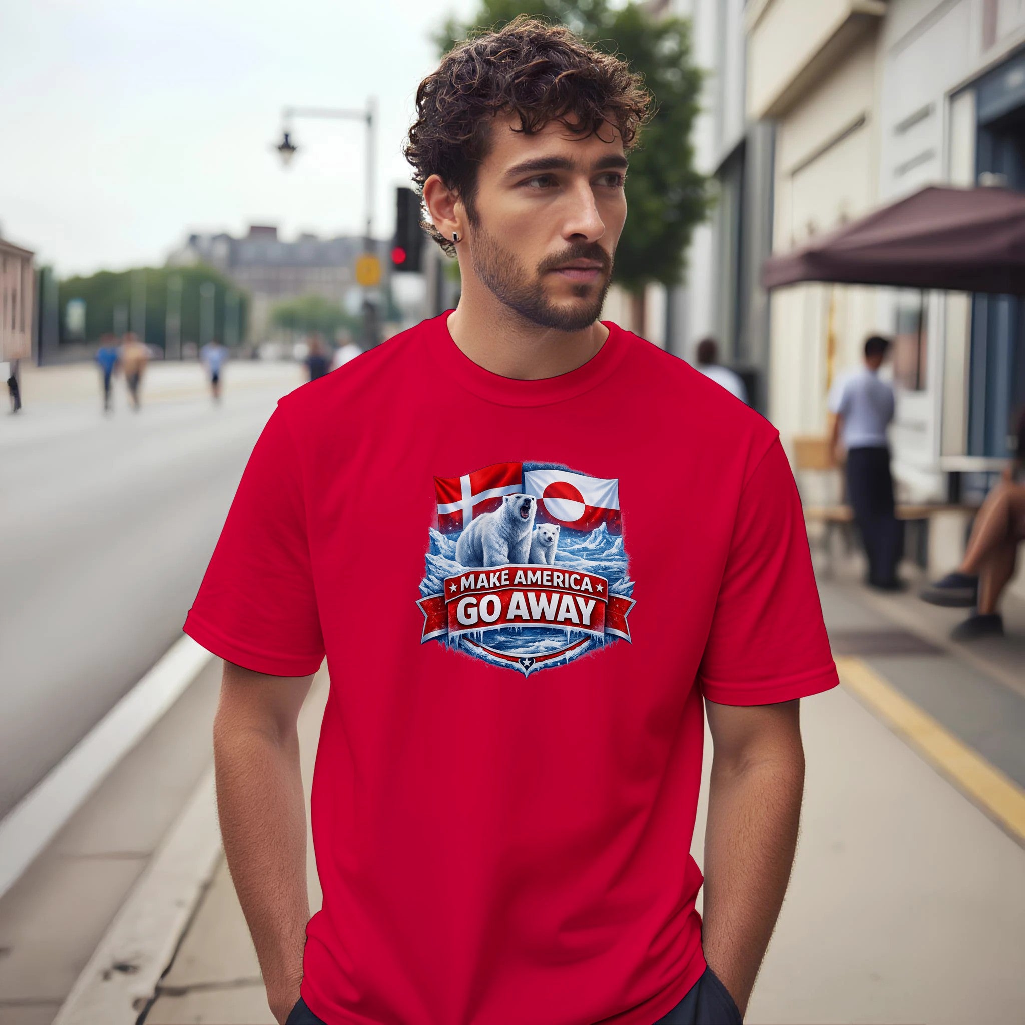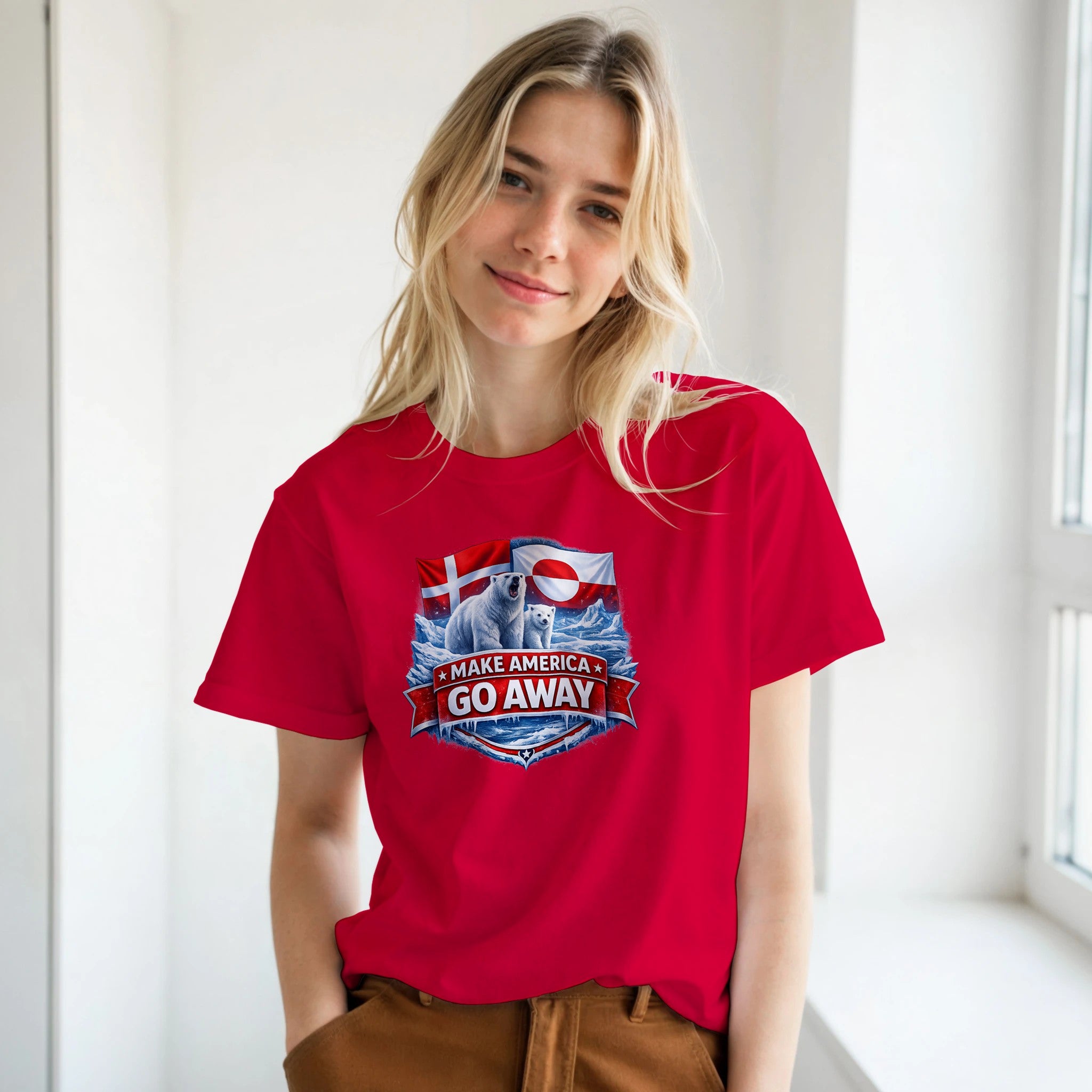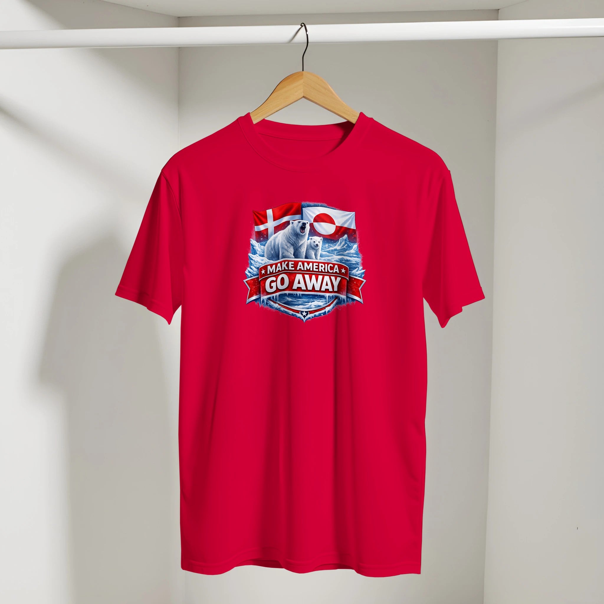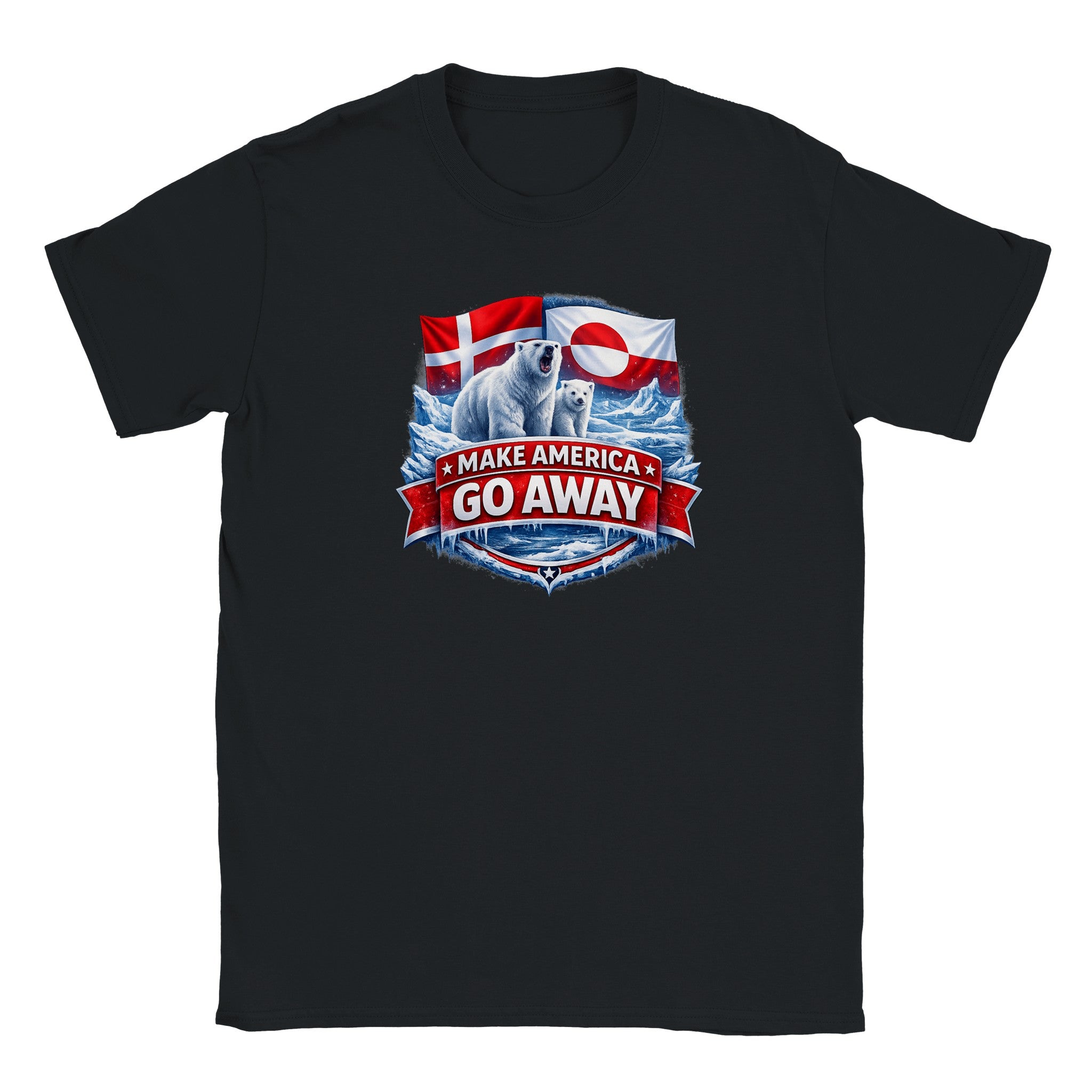Bold protest T-shirt featuring polar bears, Arctic ice, and Danish & Greenlandic flags. “MAKE AMERICA GO AWAY” is a powerful Greenland solidarity statement tee against annexation and imperialism.