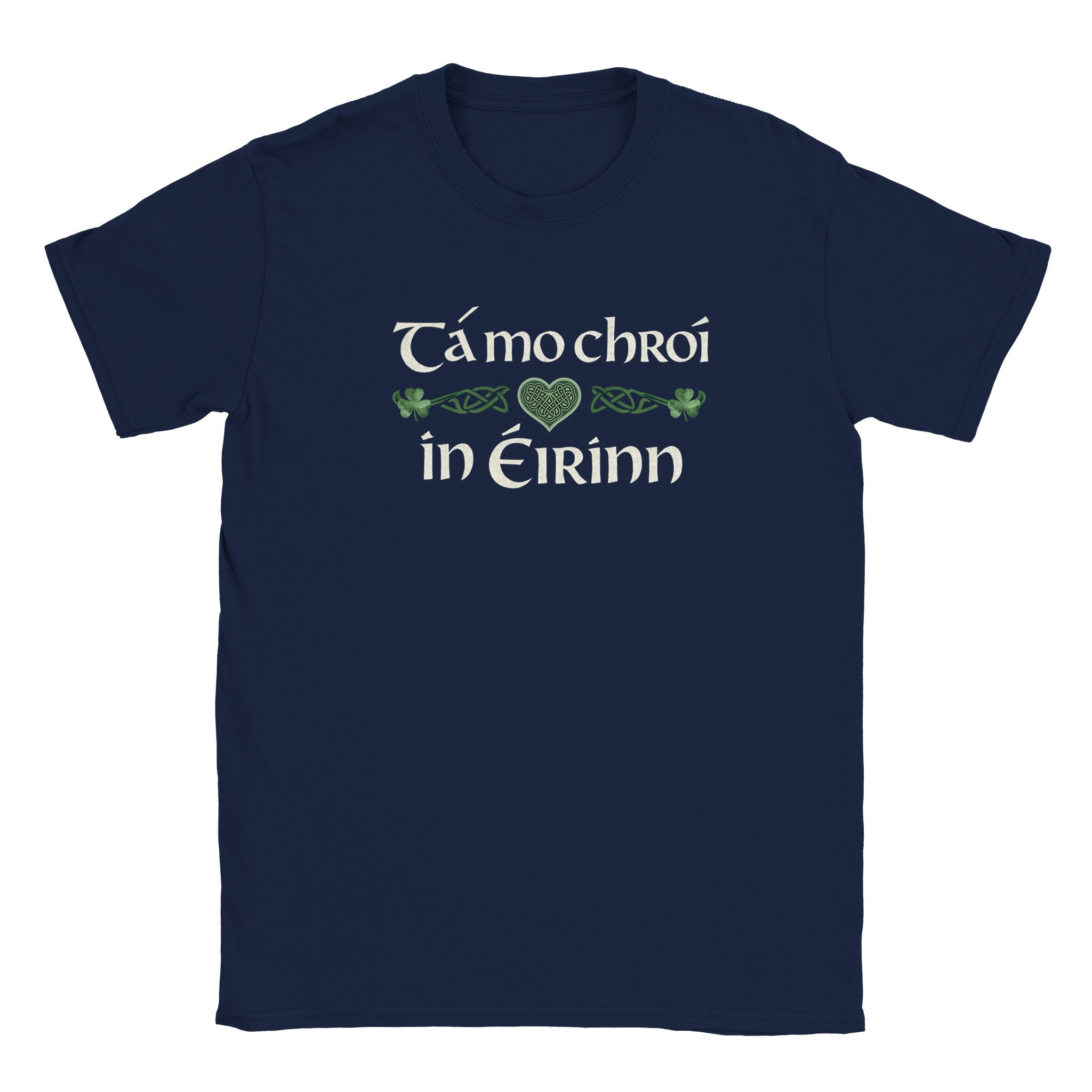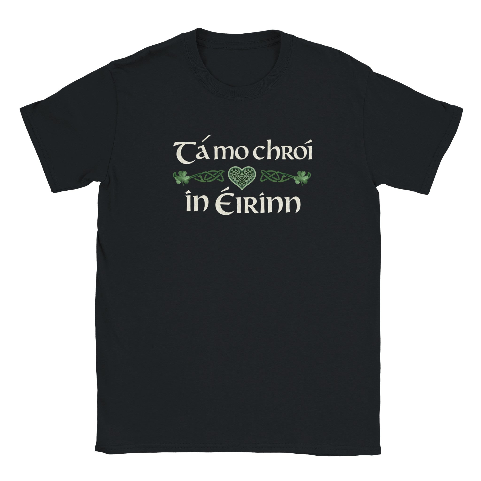 Celebrate Irish pride with this bold Tá mo chroí in Éirinn t-shirt, meaning “My heart is in Ireland” (pronounced Taw muh khree in AIR-in). Featuring Celtic heart knotwork and shamrock detail, perfect for patriots and the diaspora.
