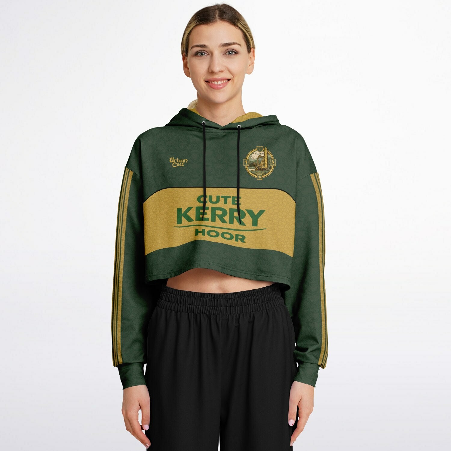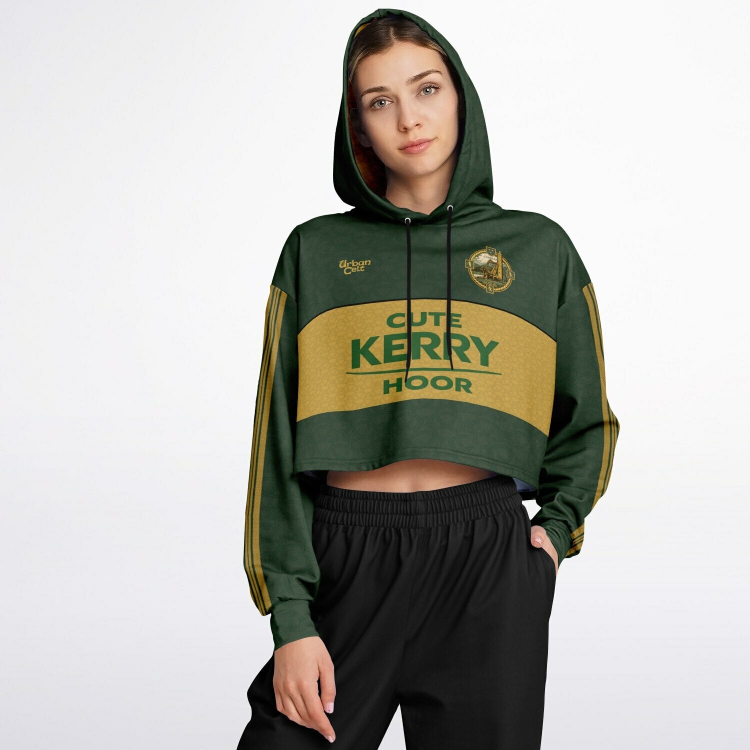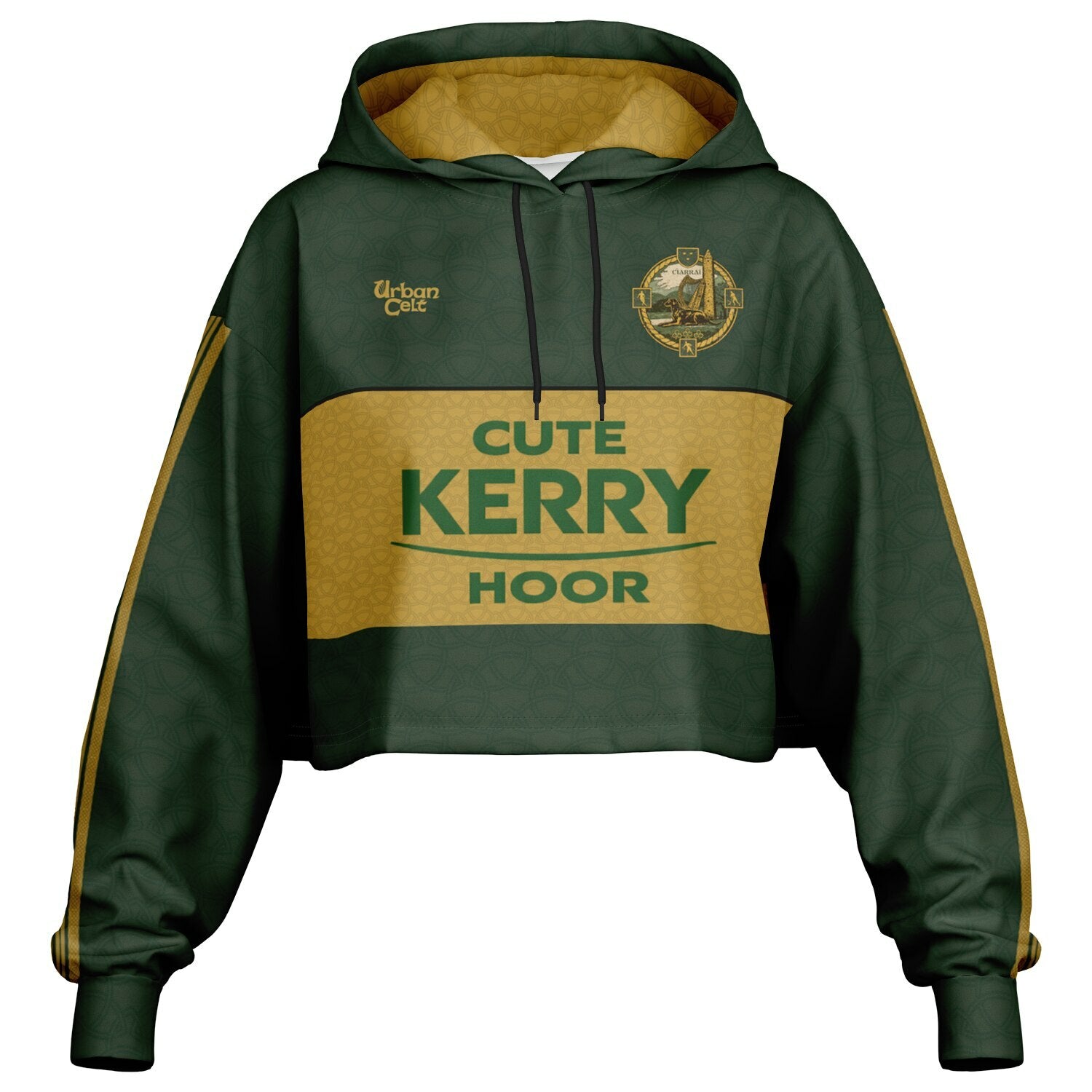 Inspired by Kerry’s iconic sponsor styling, this “Cute Kerry Hoor” women's crop hoodie blends county pride with pure Kingdom wit. Featuring Celtic art, a redesigned crest based on the old Kerry crest and Celtic styled stripes. Perfect for fans backing the Kerry GAA teams all season long — home, away, and into the pub after. Up the Kingdom!