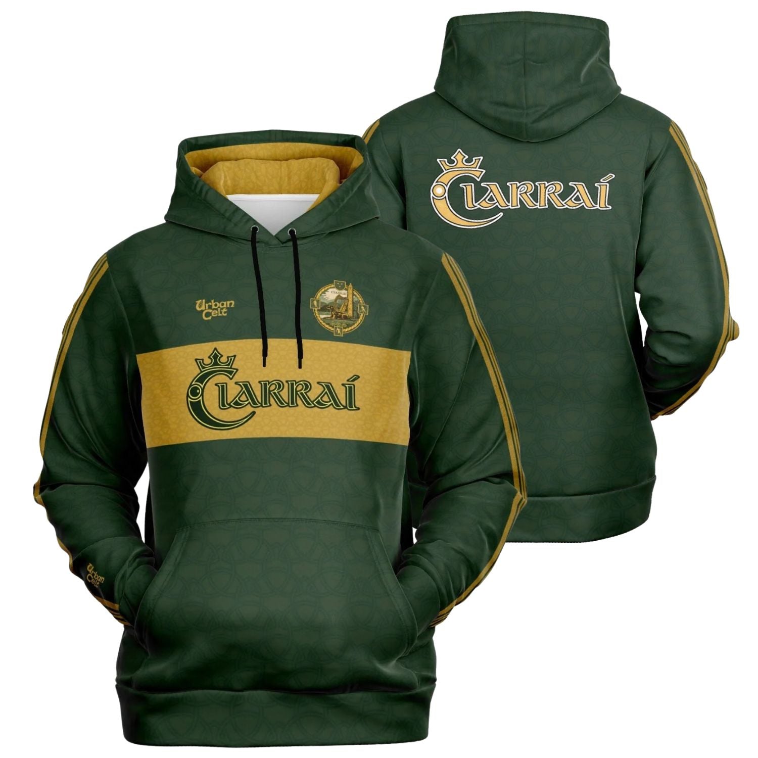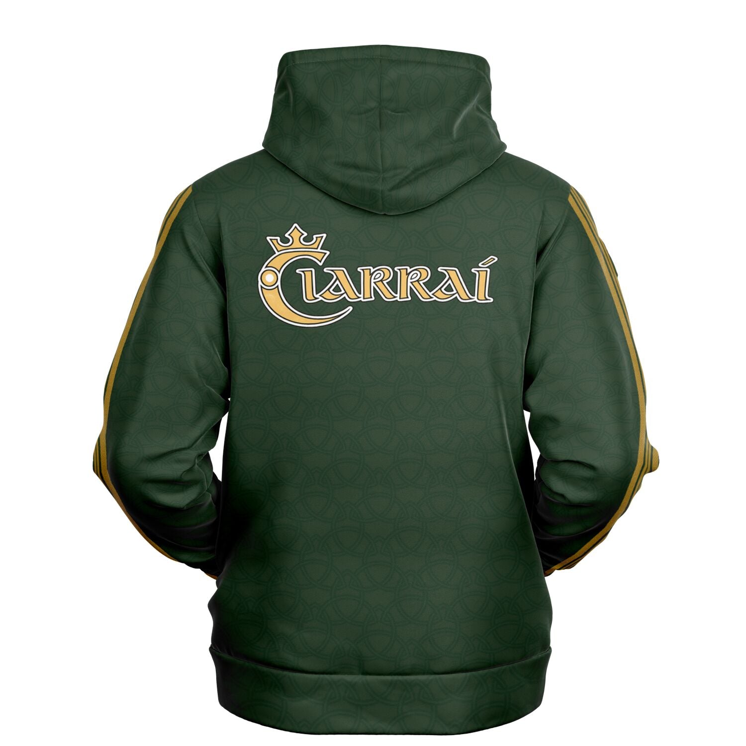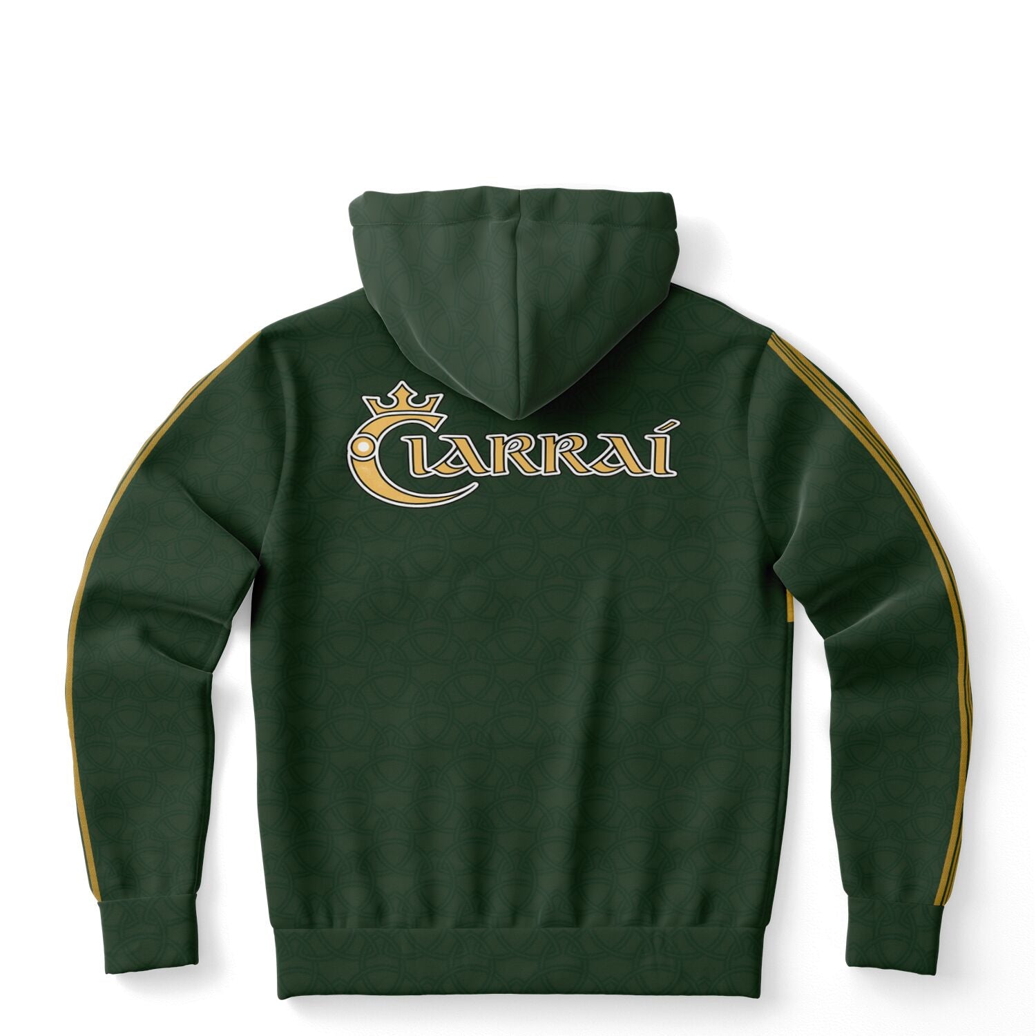Premium Kerry GAA hoodie in deep green with subtle Celtic knot detailing and bold gold celtic detail panel and Celtic styled stripes on the sleeves Featuring a reimagined Kerry crest and “Ciarraí” front and back, this Gaelic Games inspired design blends tradition, heritage and modern county pride.