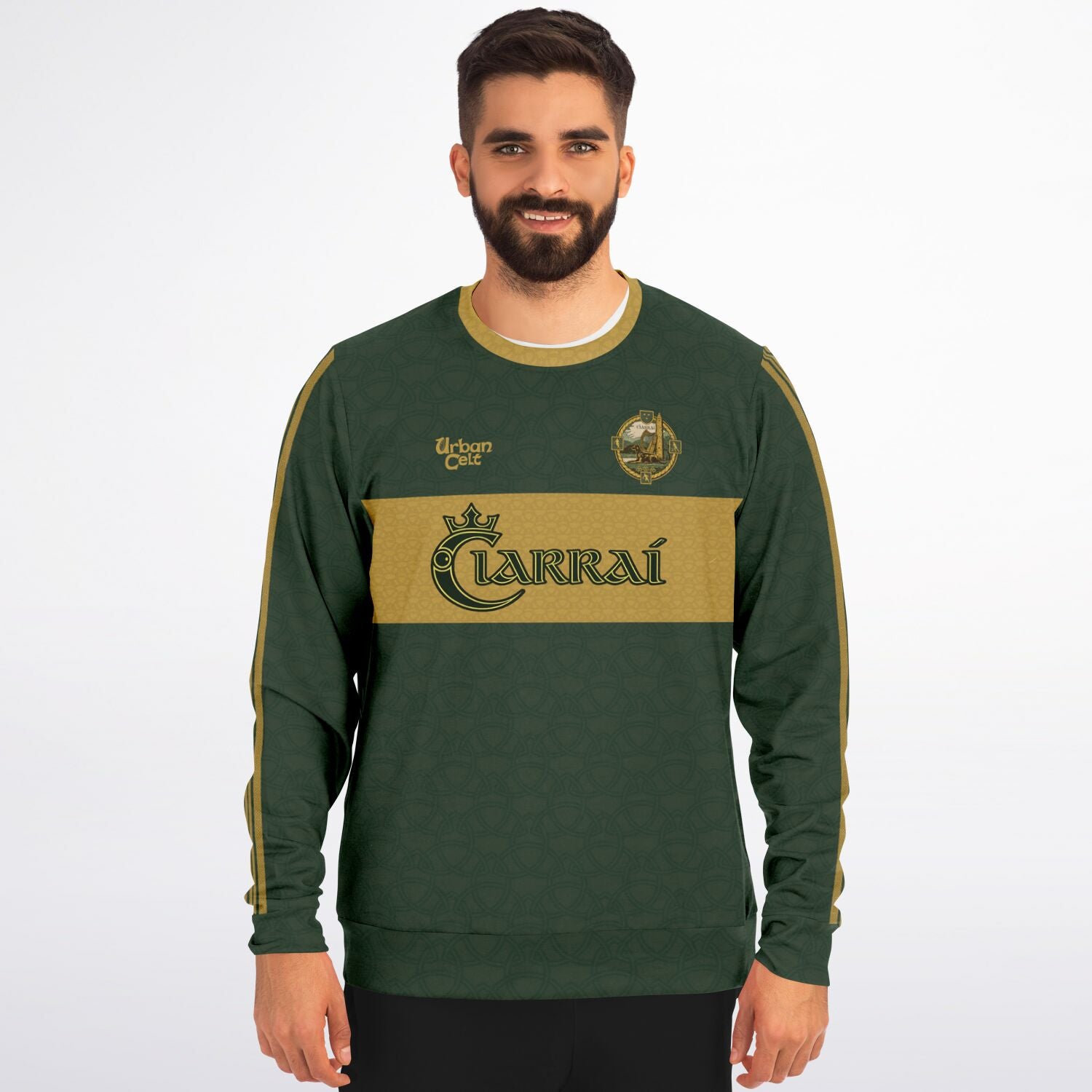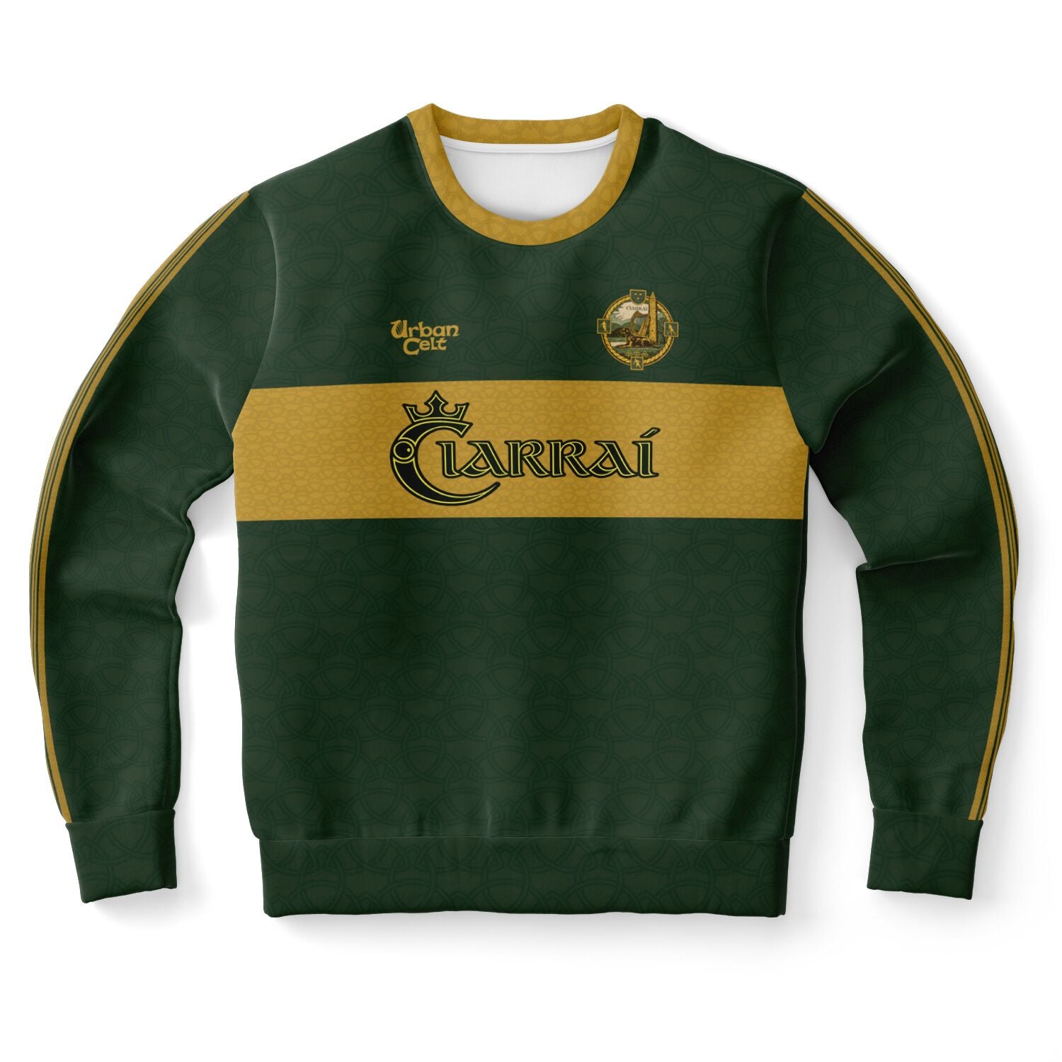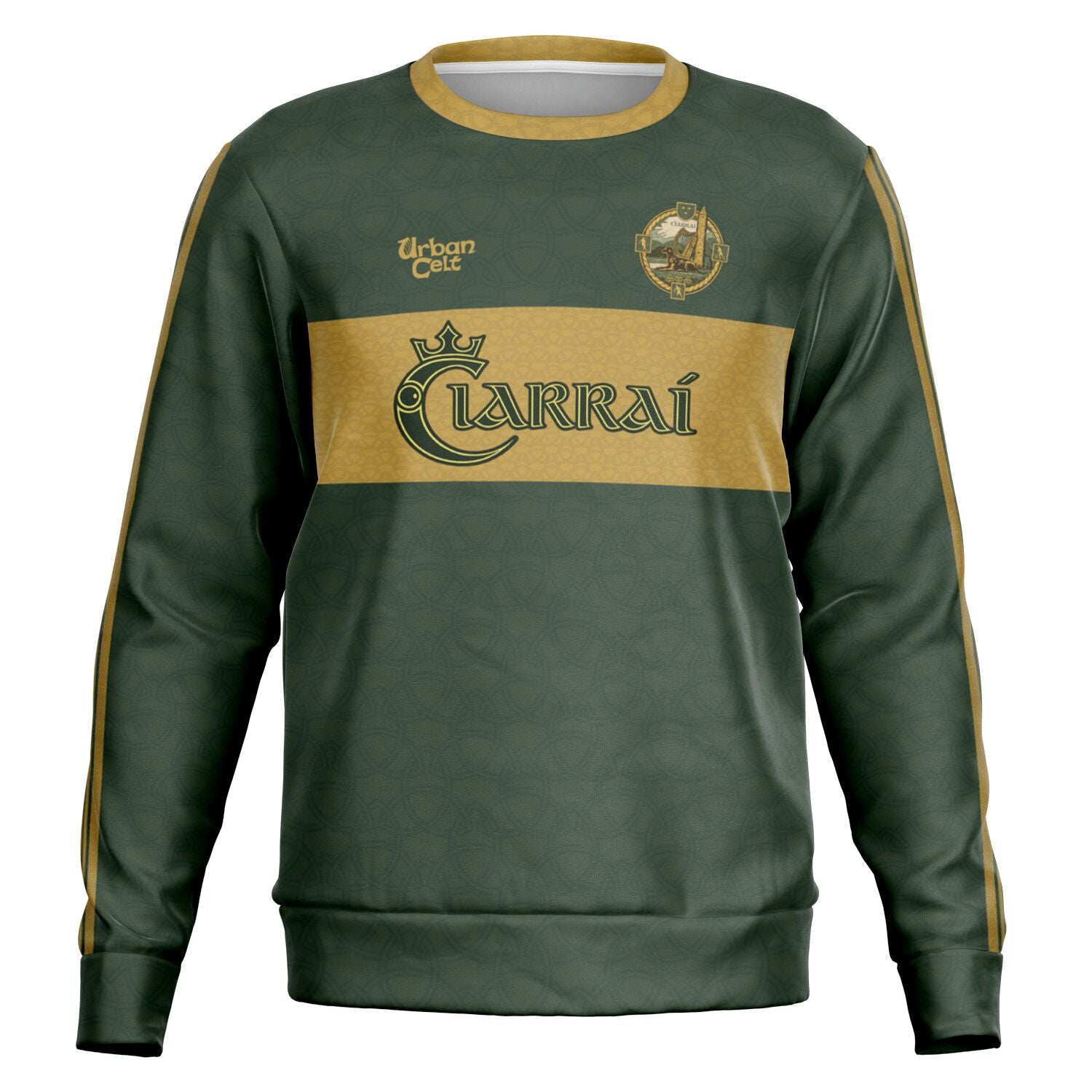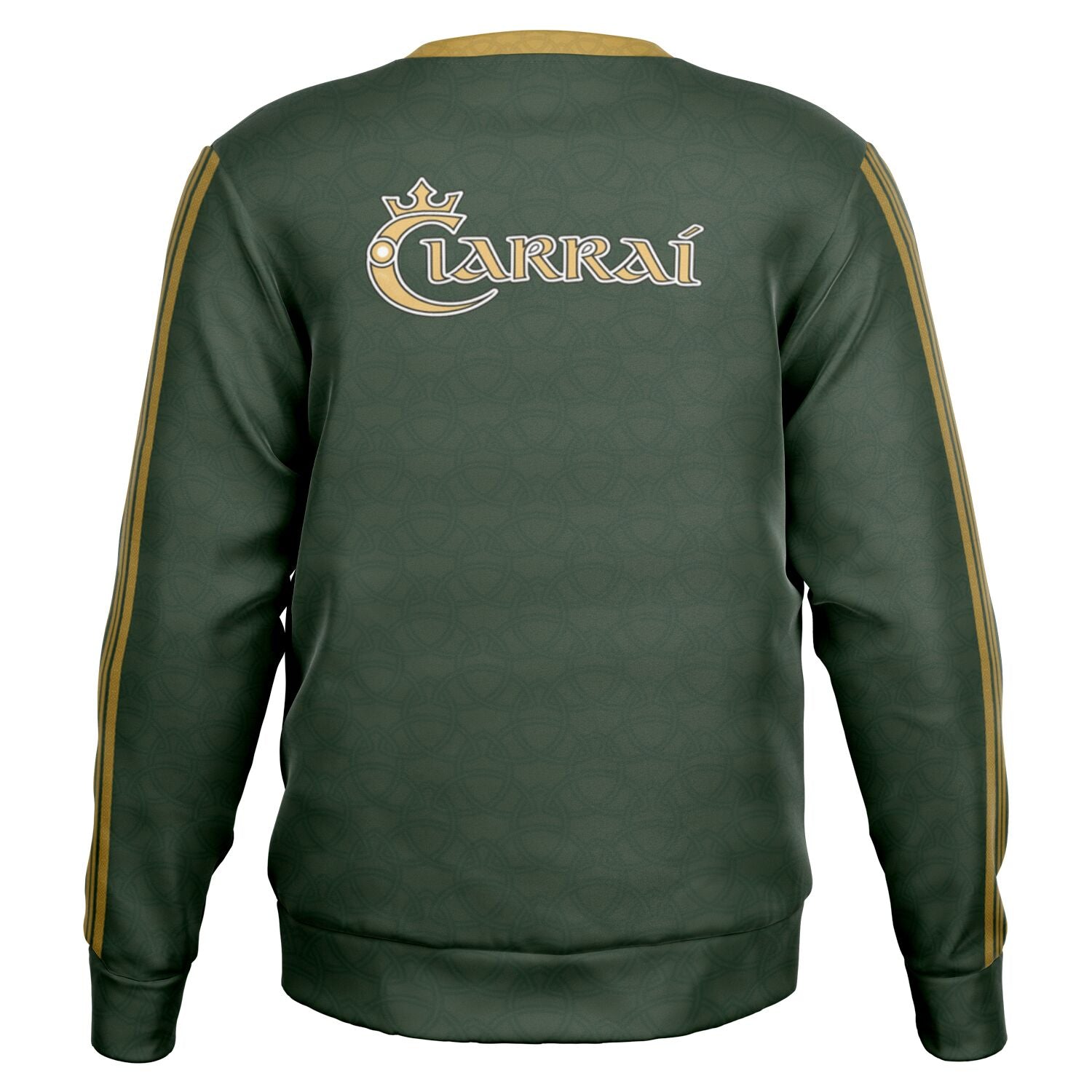 Dark green Kerry GAA sweatshirt with gold Celtic stripe detailing and redesigned vintage-style Kerry crest. “Ciarraí” across the chest and back creates a bold Gaelic Games statement piece inspired by tradition and modern county pride.