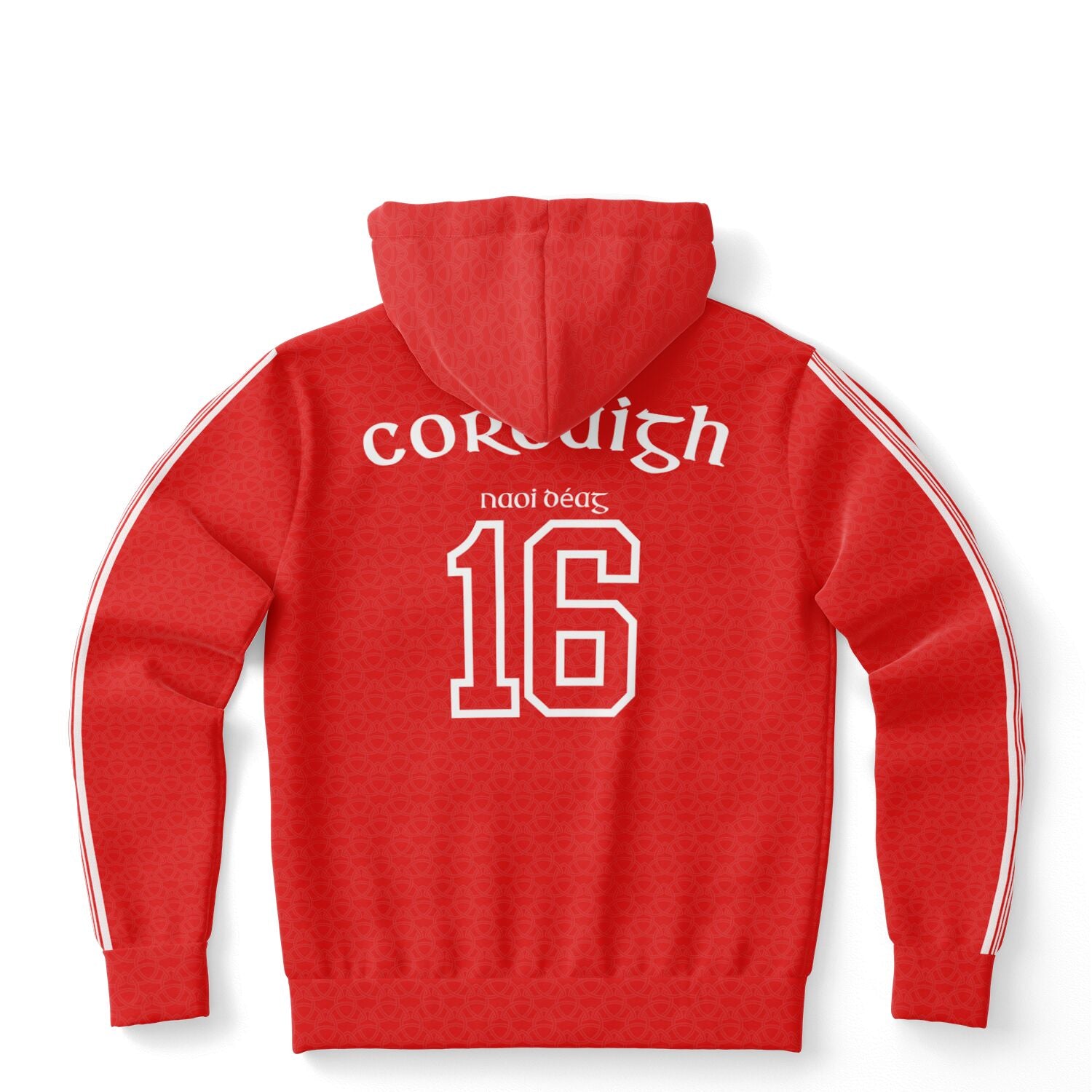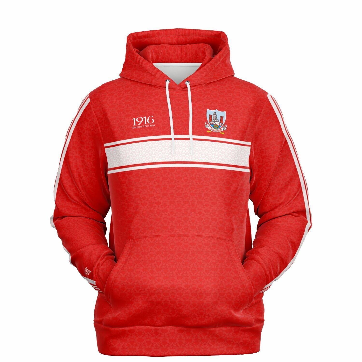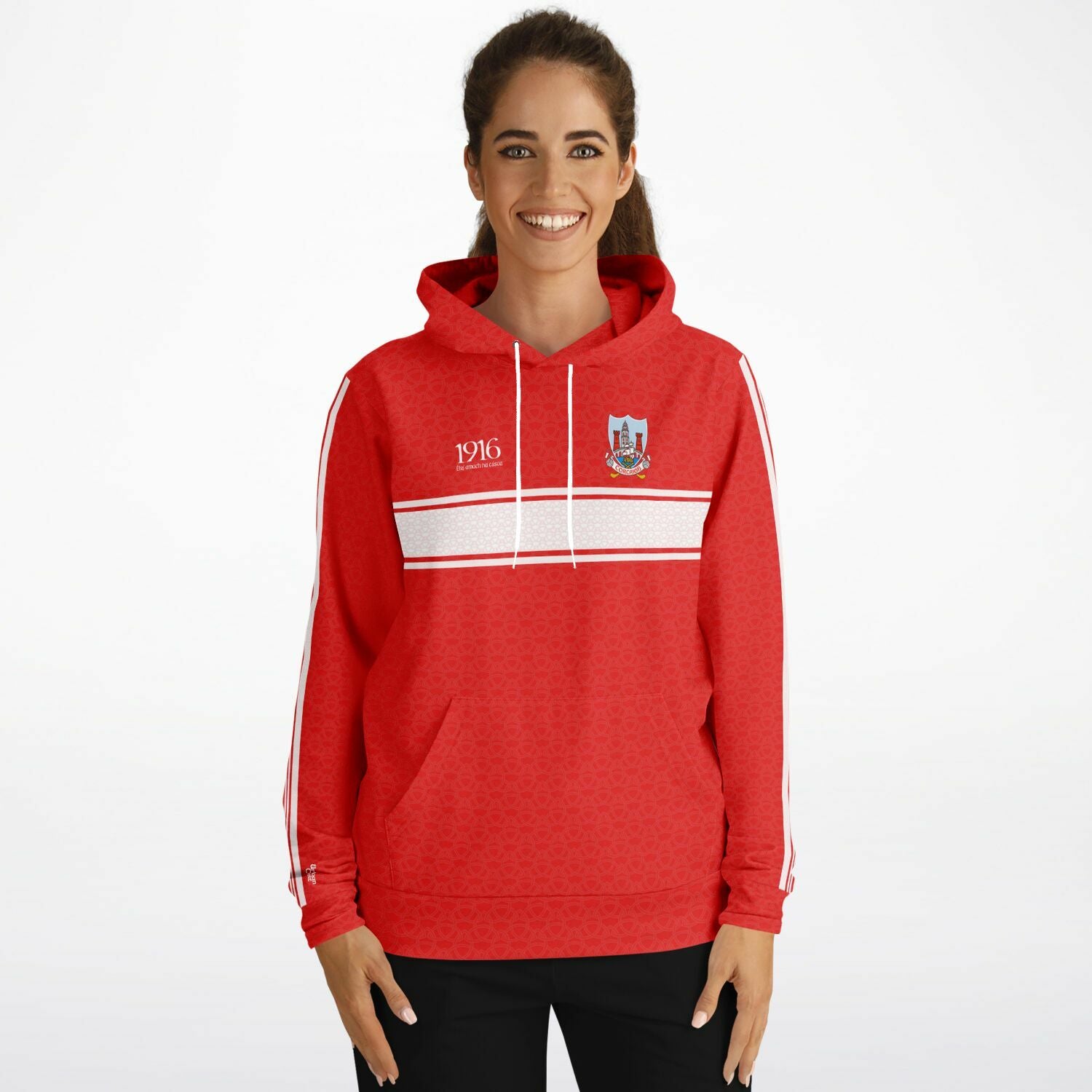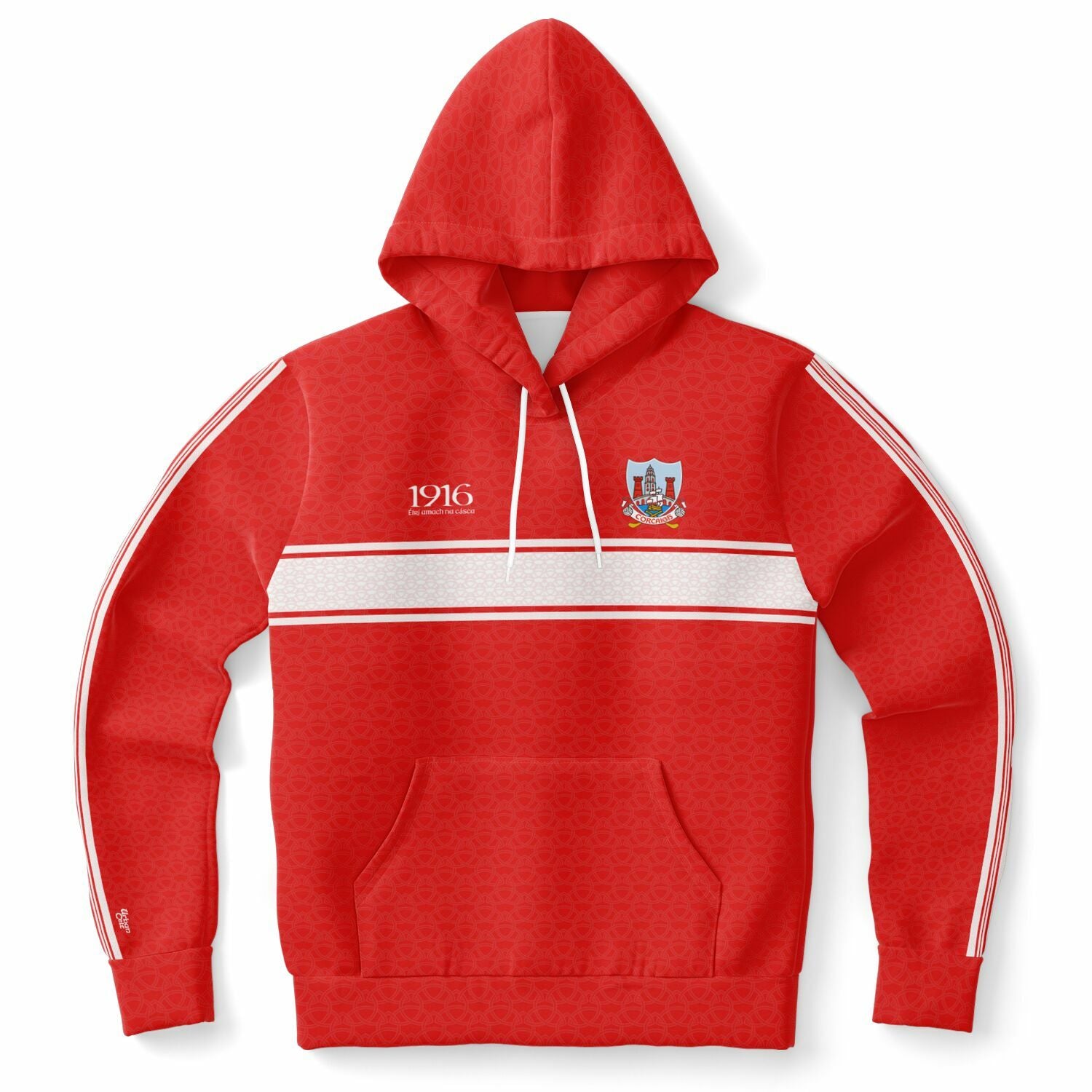 Cork 1916 Easter Rising hoodie featuring red Celtic knot detail, white Celtic stripes on chest and sleeves, Cork crest and Éirí Amach na Cásca on front, with Corcaigh naoi déag(ninteen) 16 on the back. Irish rebel heritage style.