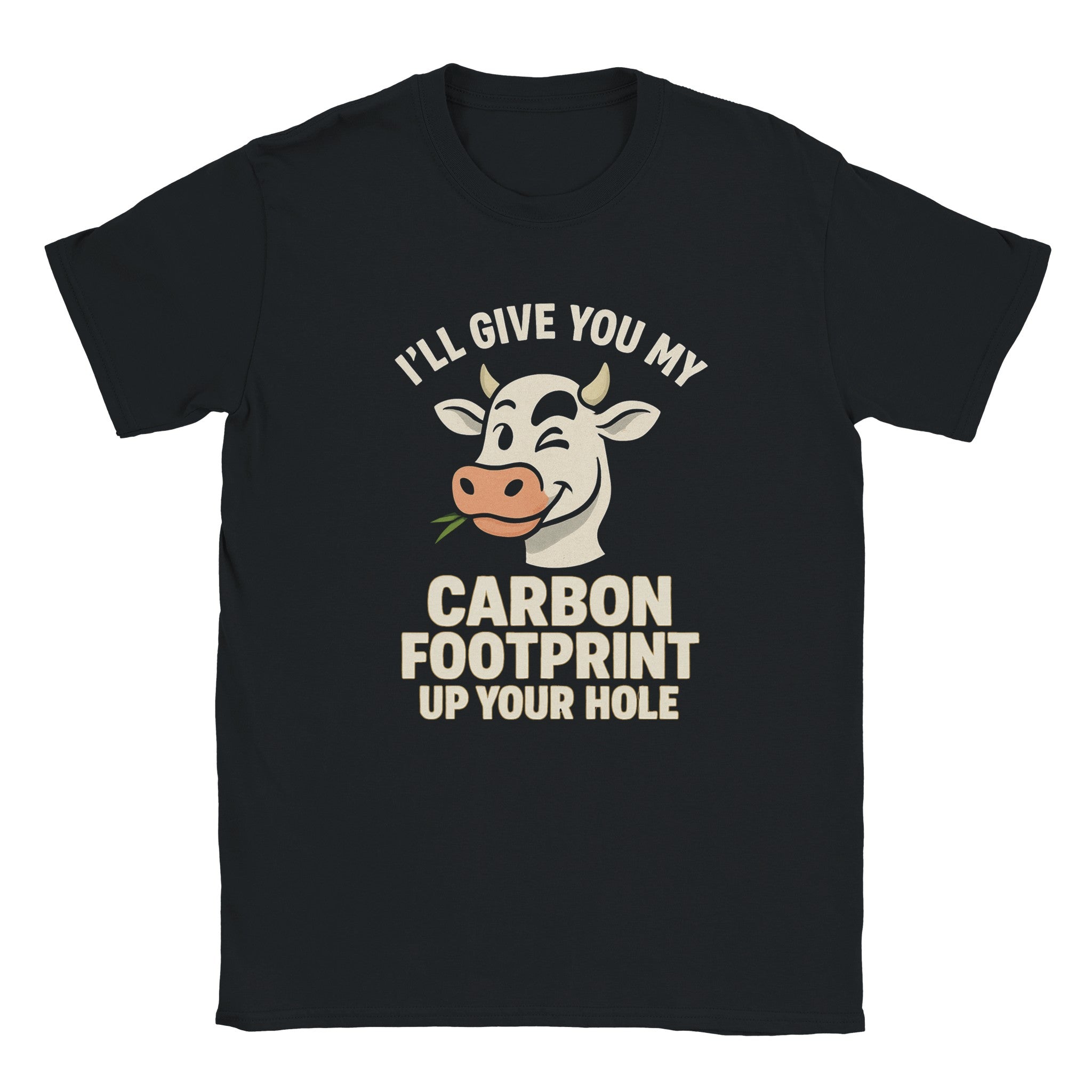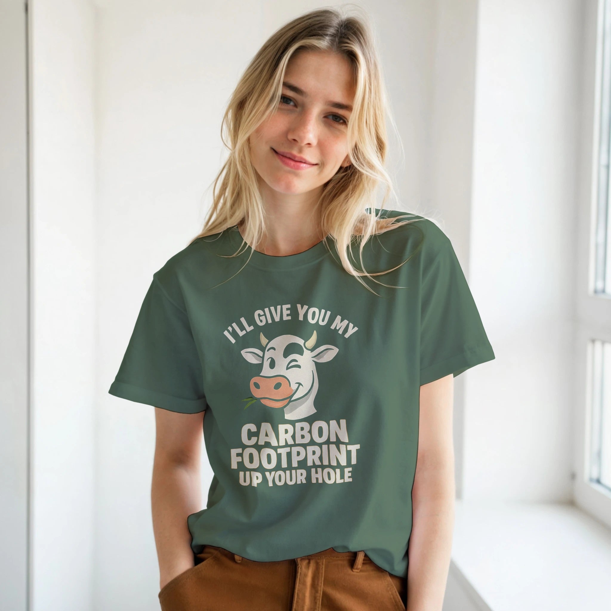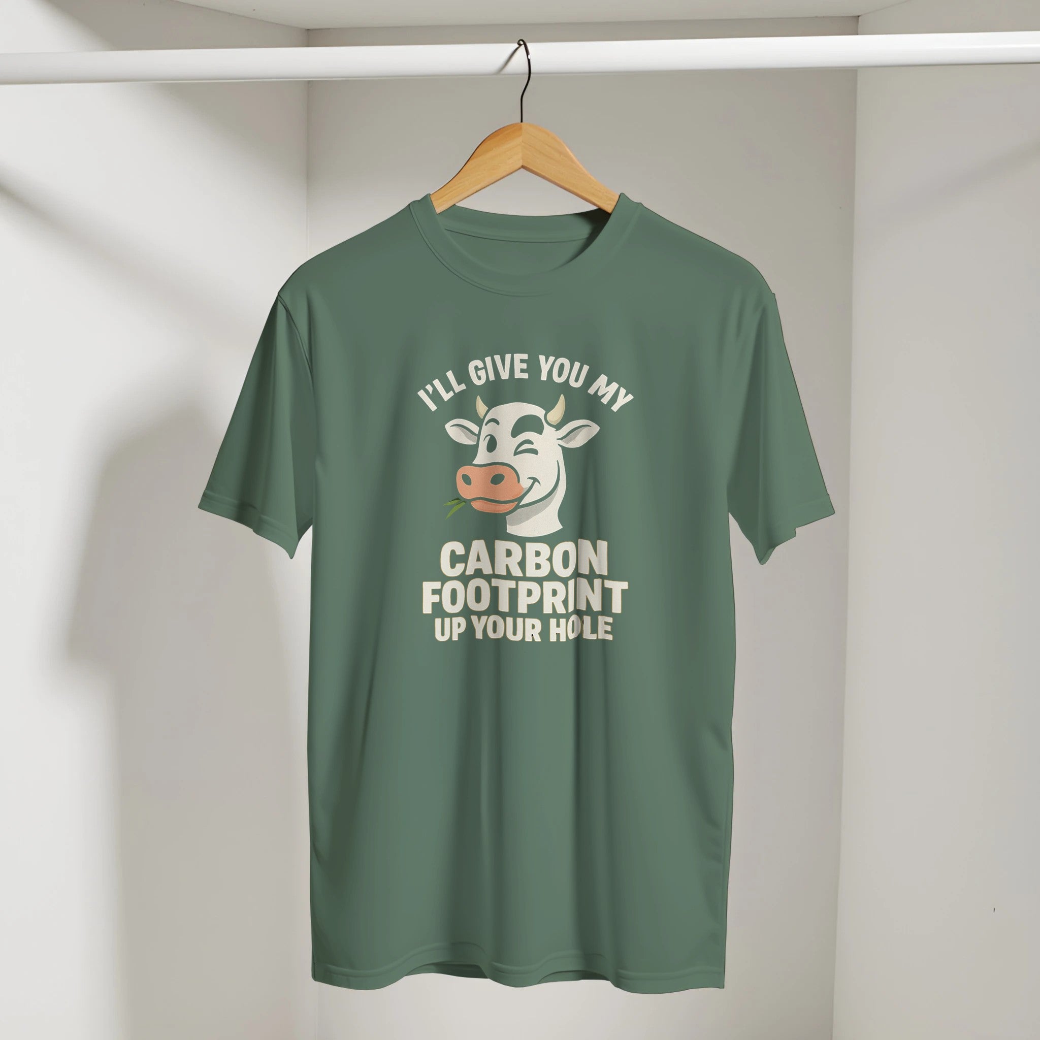 A bold, cheeky Irish-humour t-shirt featuring a winking cow and the text “I’ll Give You My Carbon Footprint Up Your Hole.” Perfect for eco rebels, farmers, and anyone who loves a bit of craic and banter. Soft, durable, and guaranteed to start conversations.