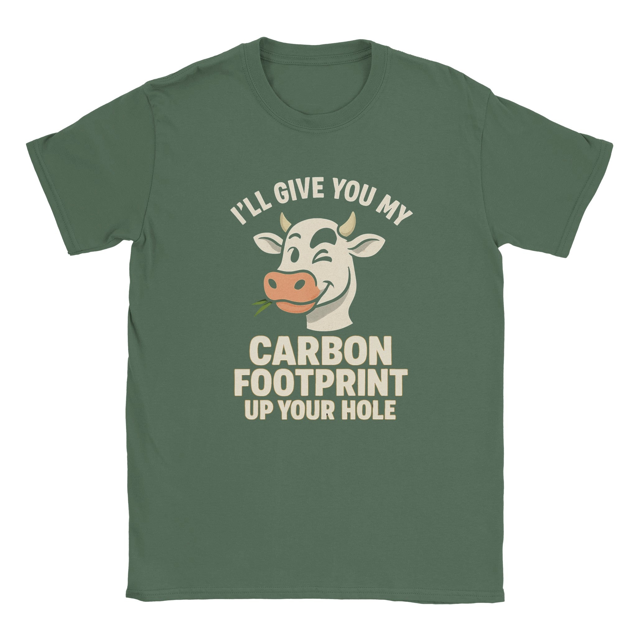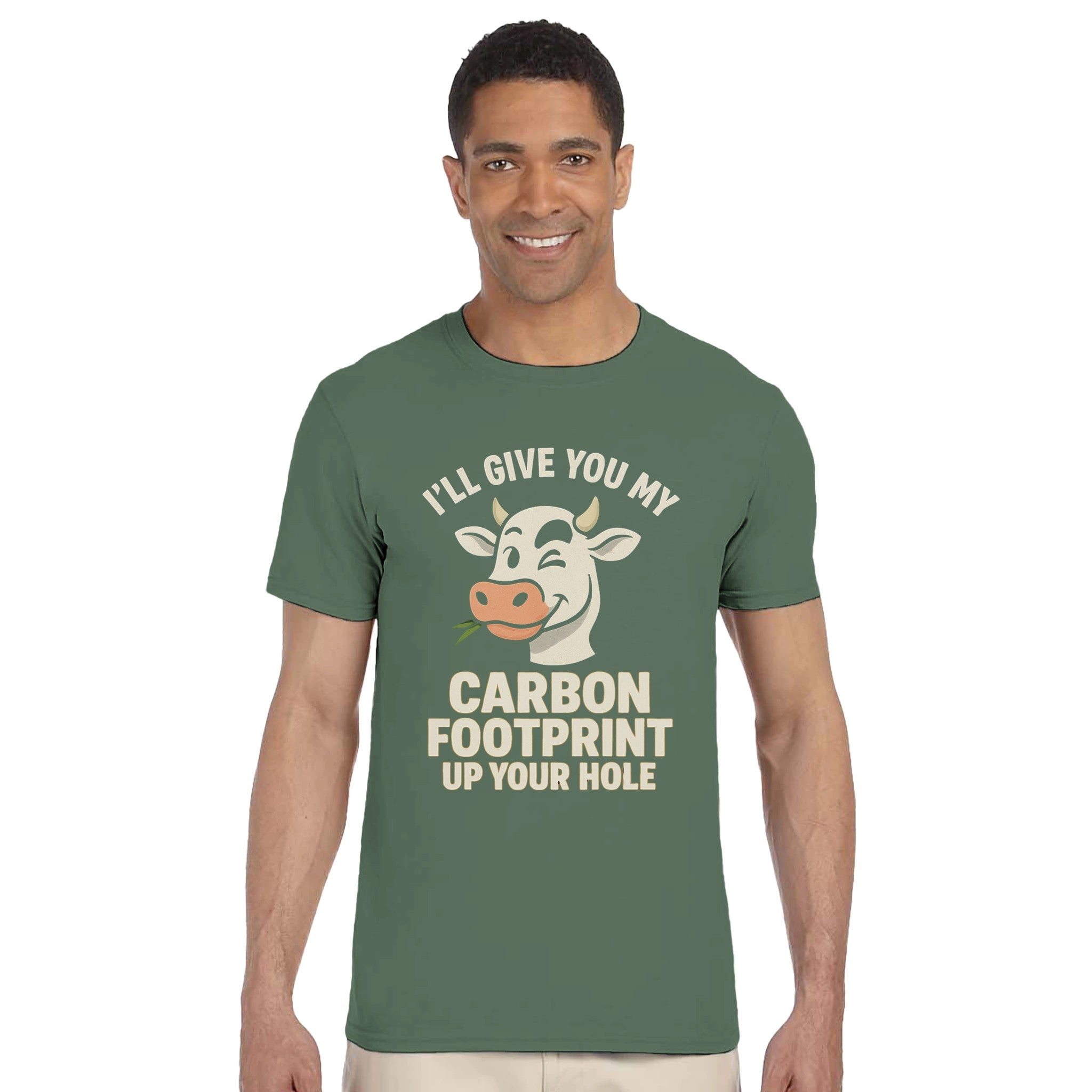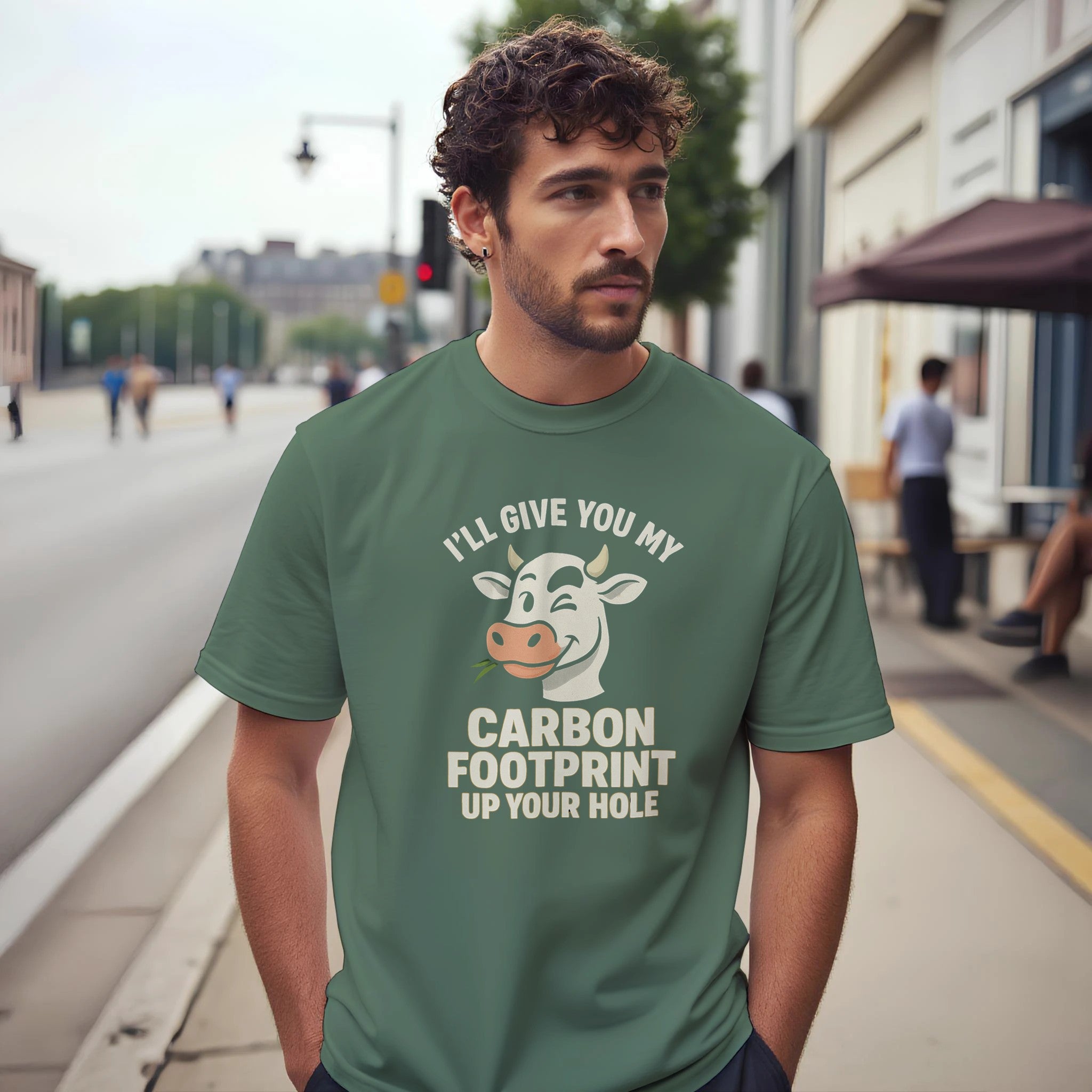 A bold, cheeky Irish-humour t-shirt featuring a winking cow and the text “I’ll Give You My Carbon Footprint Up Your Hole.” Perfect for eco rebels, farmers, and anyone who loves a bit of craic and banter. Soft, durable, and guaranteed to start conversations.