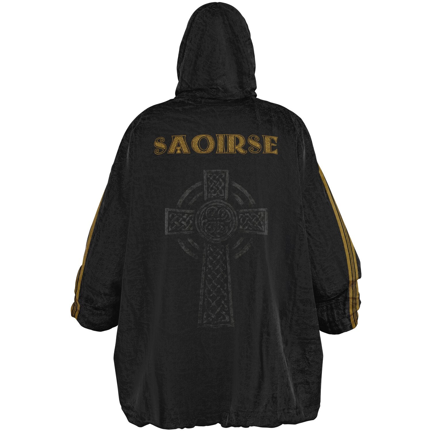 On one side, a striking black Celtic knot pattern accented with gold stripes, the Irish harp, and ‘Saoirse’ paired with a Celtic cross honouring freedom and tradition.