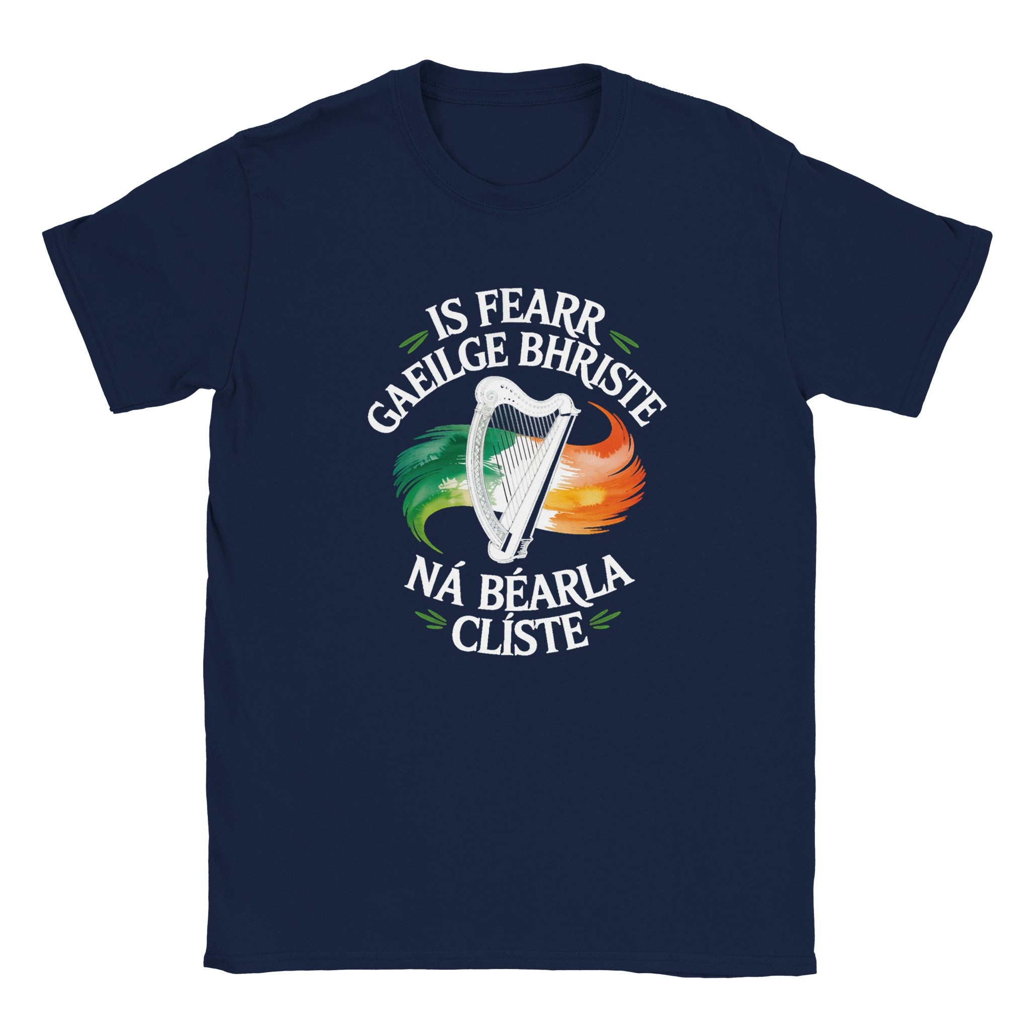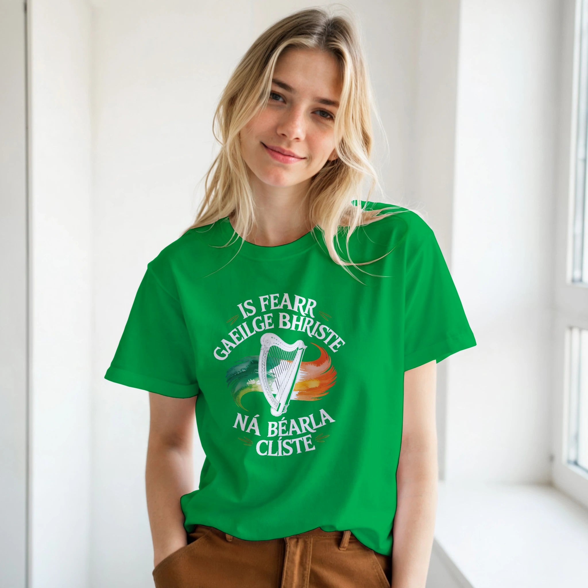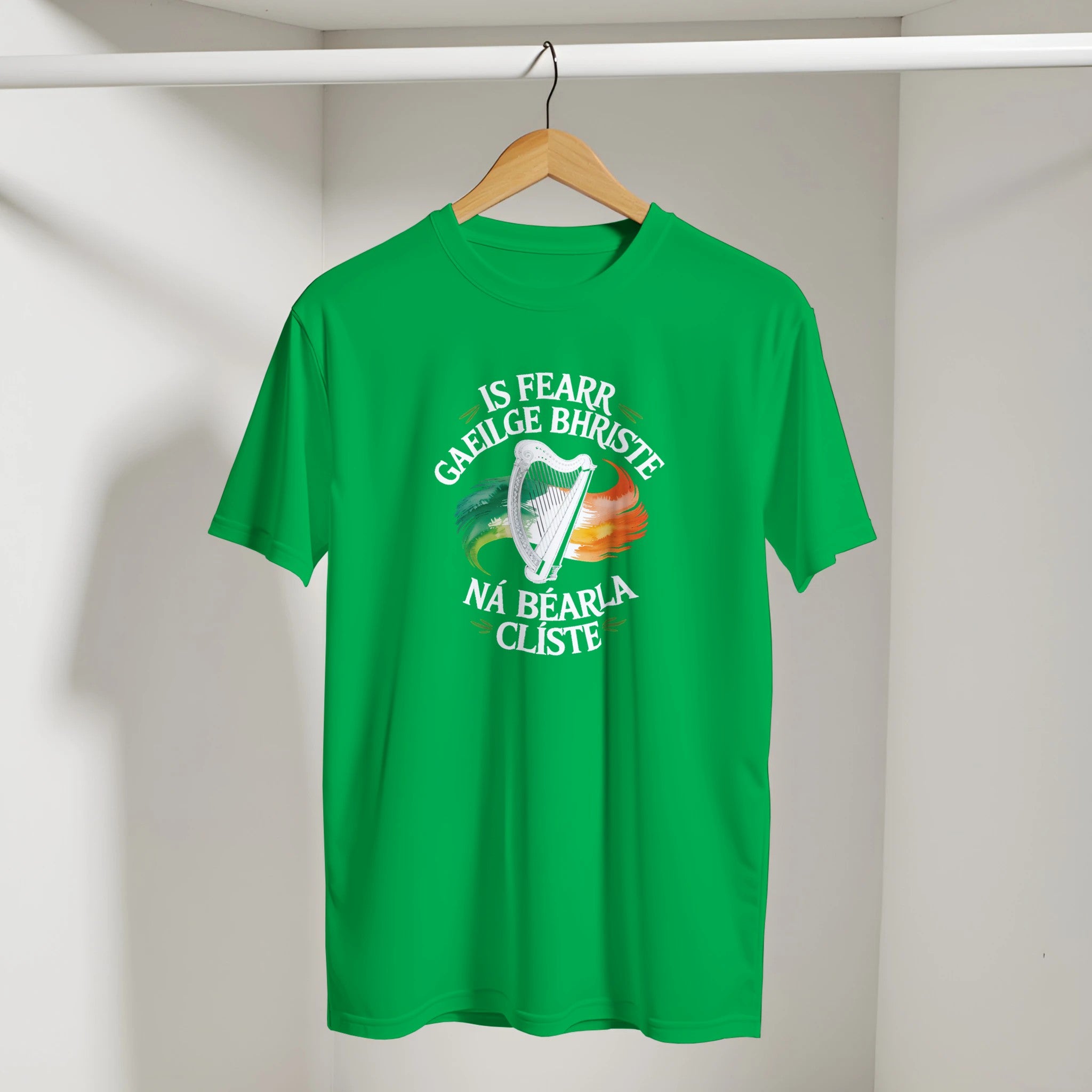 Show your love for the Irish language with this unique t-shirt design featuring the saying “Is fearr Gaeilge briste, ná Béarla clíste” – Broken Irish is better than clever English. A must-have for learners, Gaeilgeoirí, and anyone passionate about keeping the Irish language alive with pride.