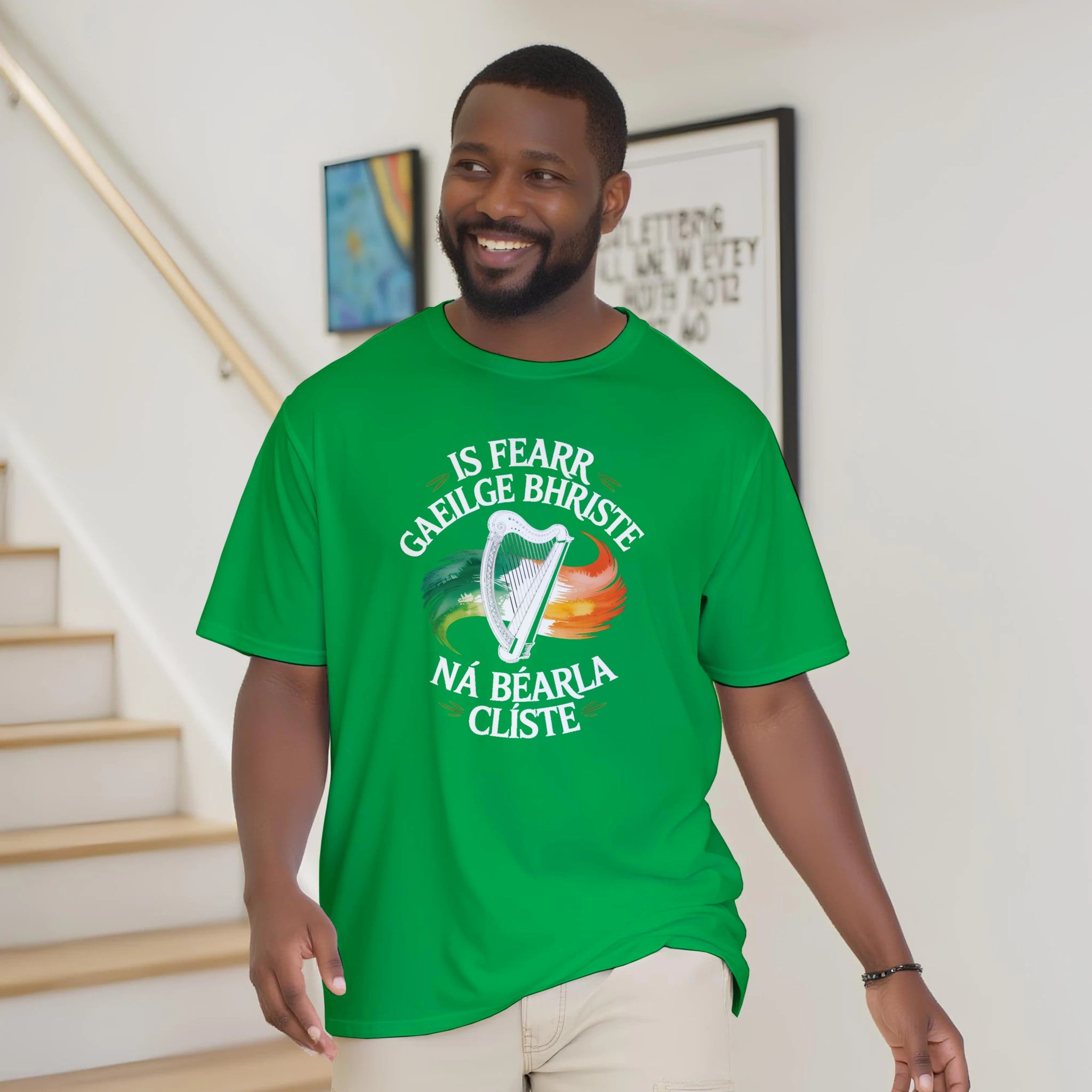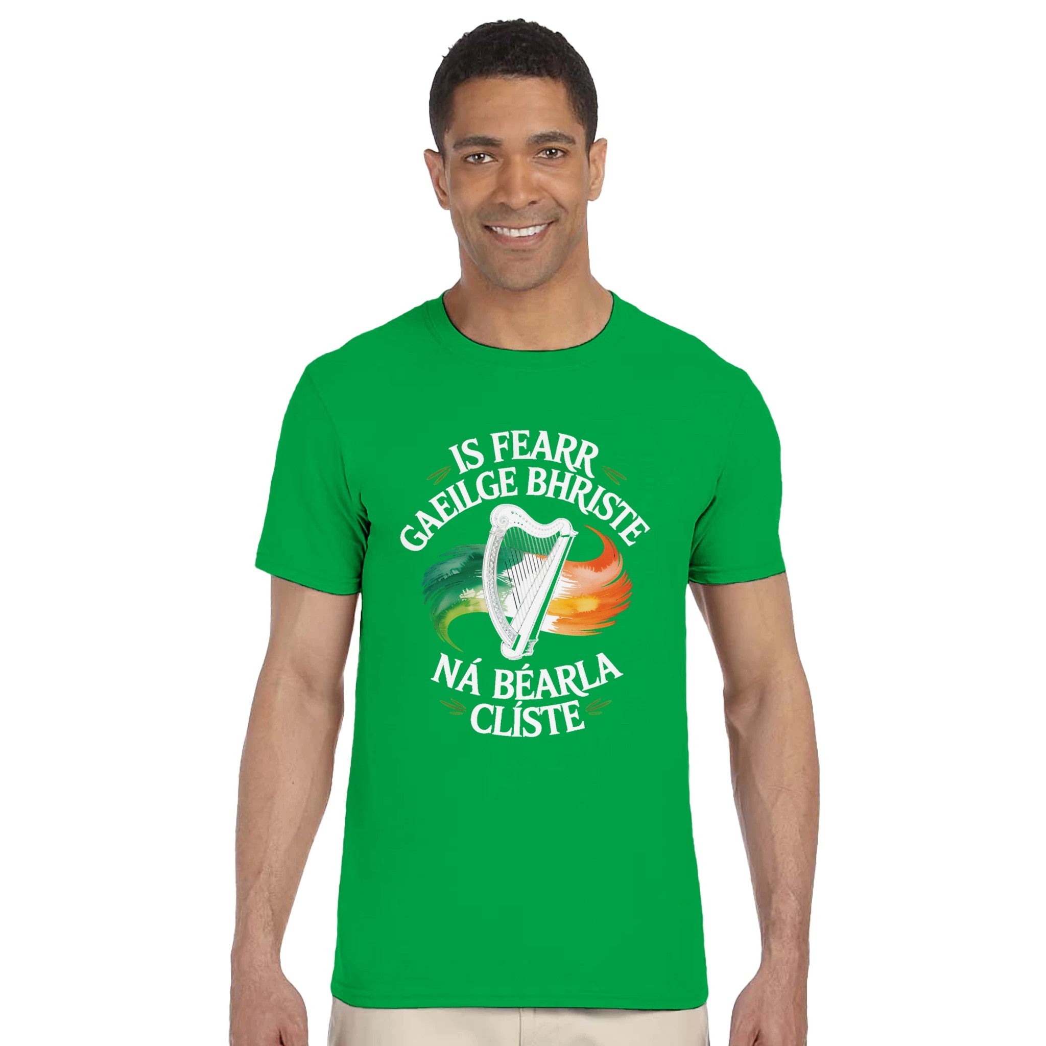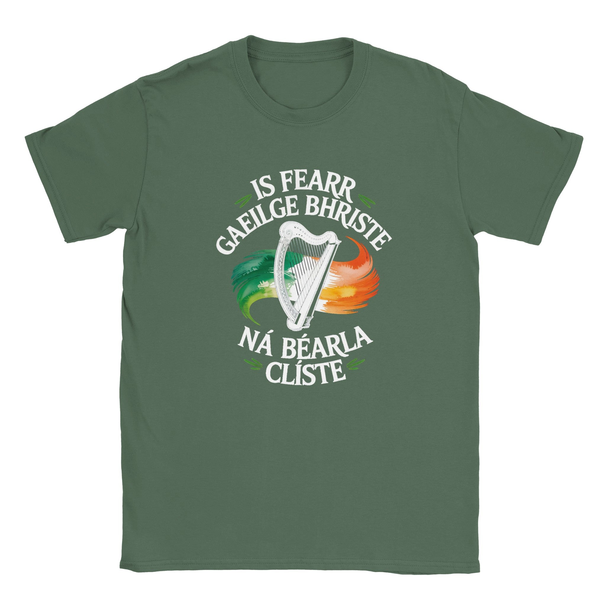 Show your love for the Irish language with this unique t-shirt design featuring the saying “Is fearr Gaeilge briste, ná Béarla clíste” – Broken Irish is better than clever English. A must-have for learners, Gaeilgeoirí, and anyone passionate about keeping the Irish language alive with pride.