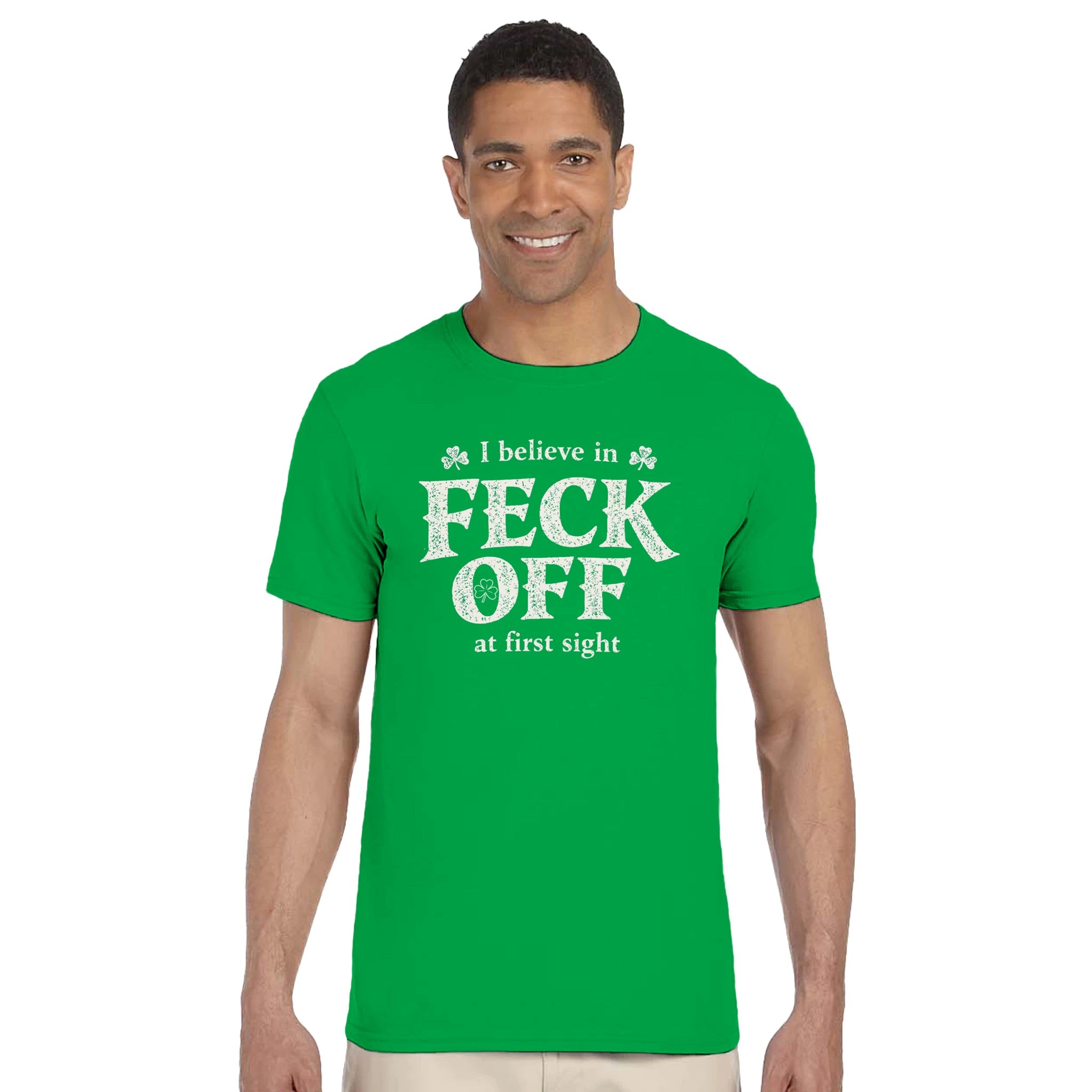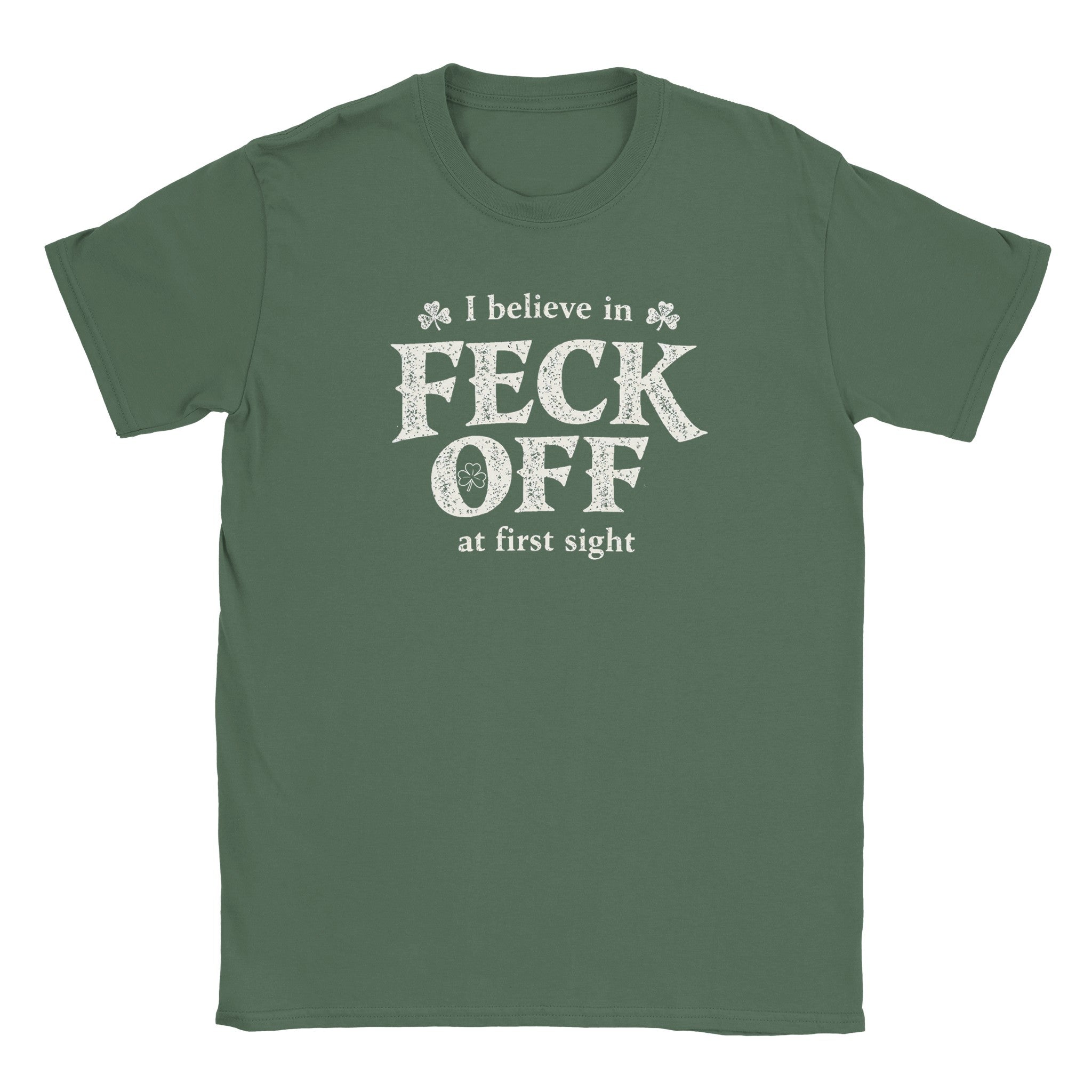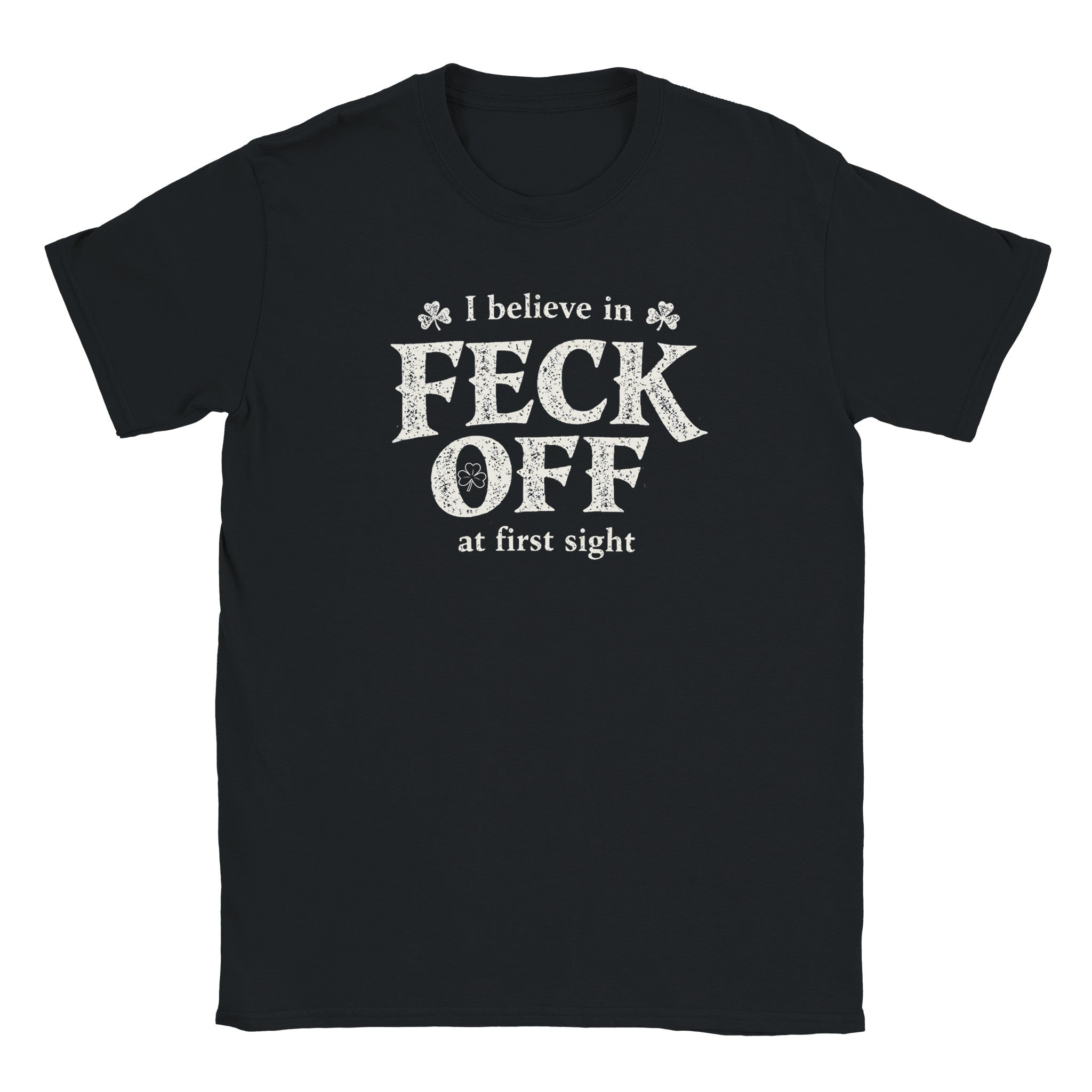 A bold Irish humour t-shirt featuring the phrase “I believe in Feck Off at first sight.” Designed in an old Celtic pub-style font with a vintage distressed finish. Perfect for fans of dry Irish sarcasm, wit, and straight-talking humour.