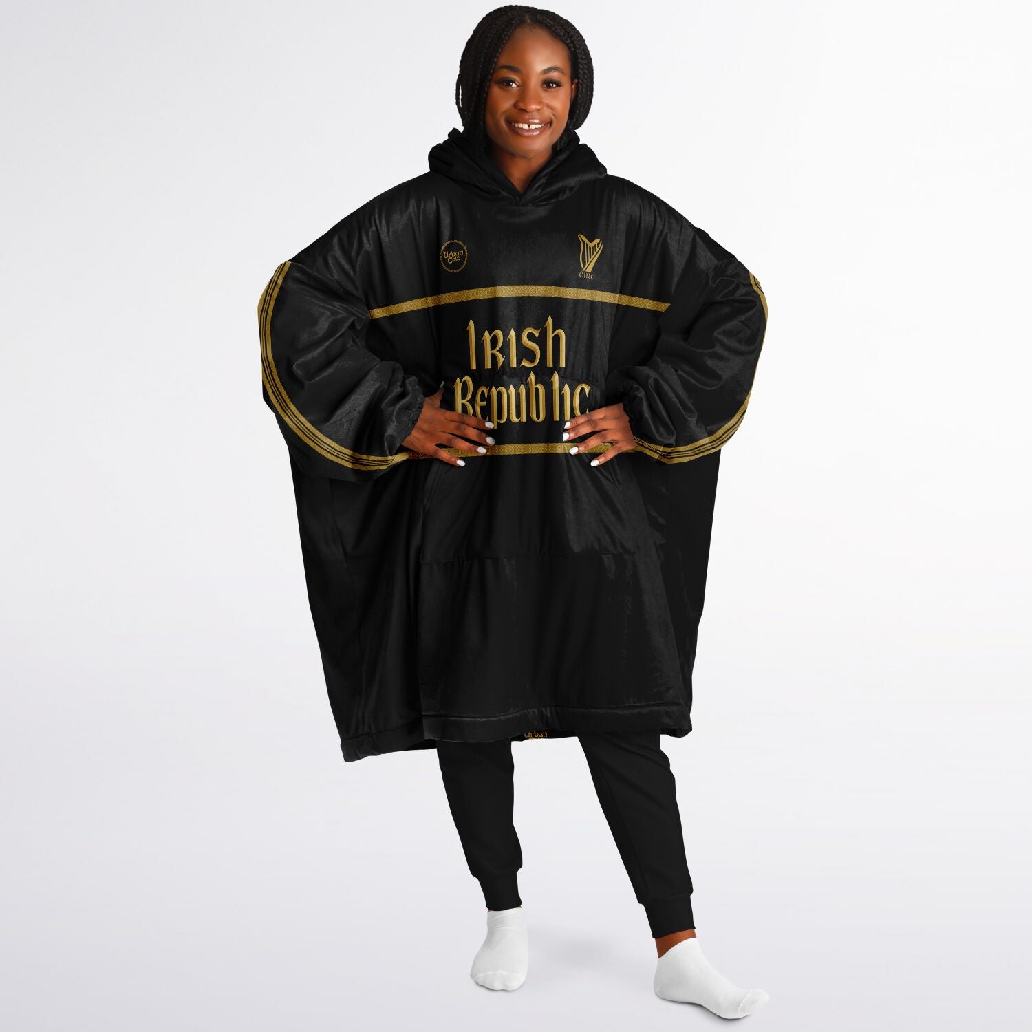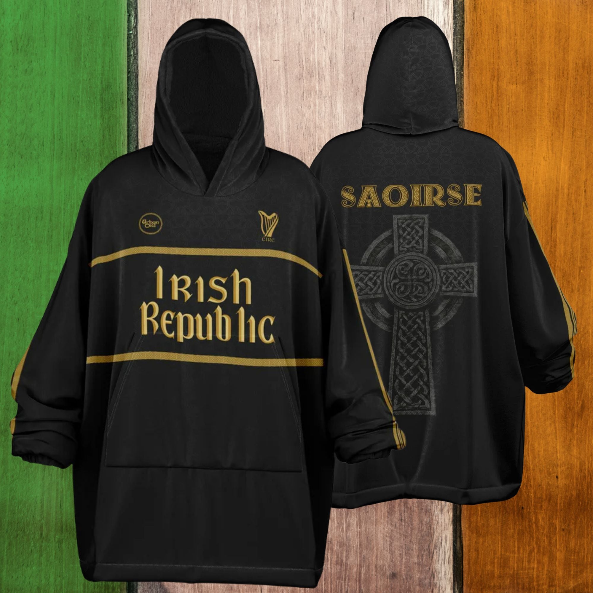 Our custom designed fleece lined hoodie features a striking black Celtic knot pattern accented with gold stripes, the Irish harp, and ‘Saoirse’ paired with a Celtic cross honouring freedom and tradition. This one-size-fits-all wearable blanket is perfect for adults up to size 5XL. Made with a silky smooth micro-mink polyester exterior and an ultra-soft black microfiber fleece interior, it’s perfect for cozying up at home or staying warm on the go.
