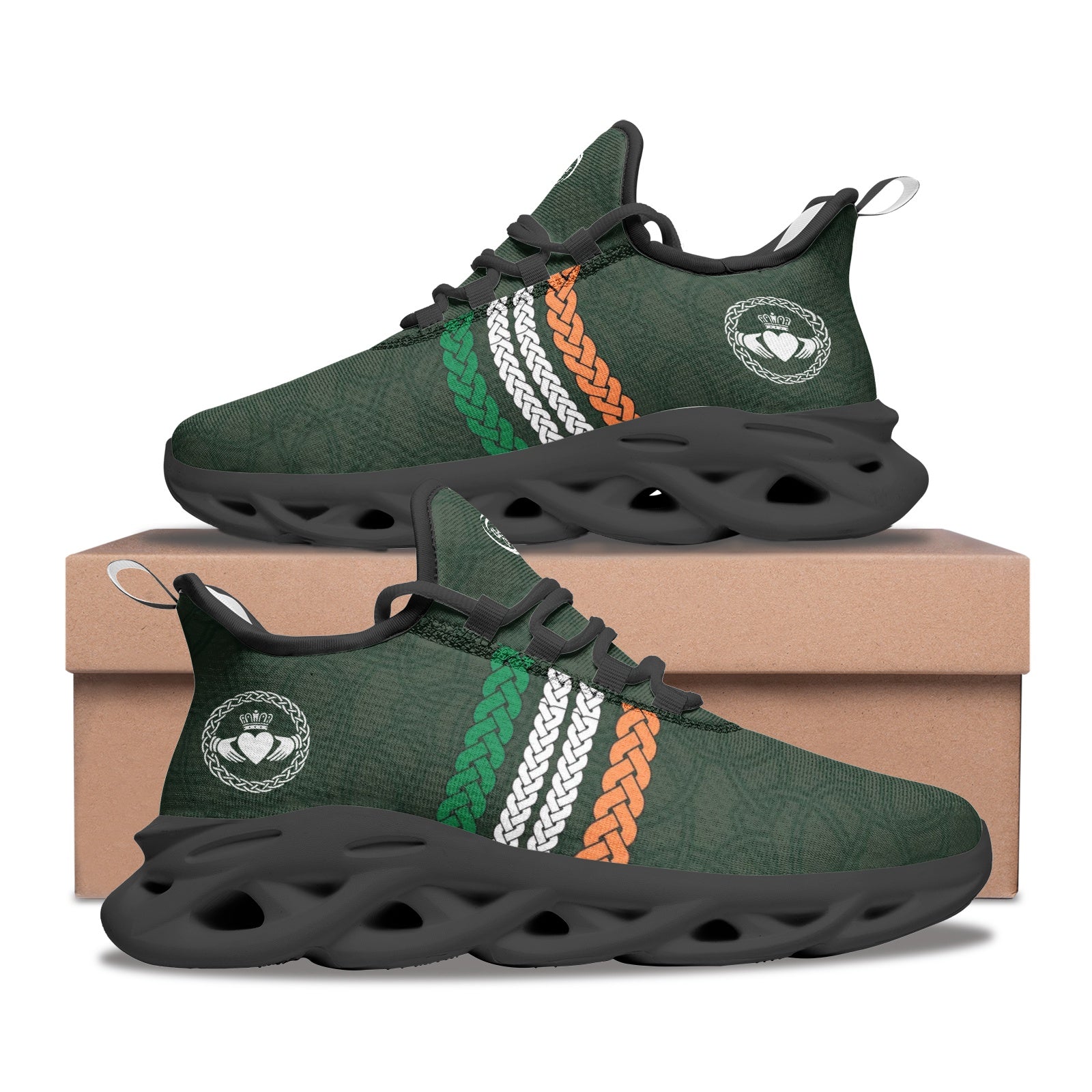 Celebrate Irish heritage with every step in these Claddagh Tricolour Bounce Sneakers. Vibrant green, white, and orange Celtic braid detailing and an intricate Claddagh emblem blend timeless tradition with contemporary street style.