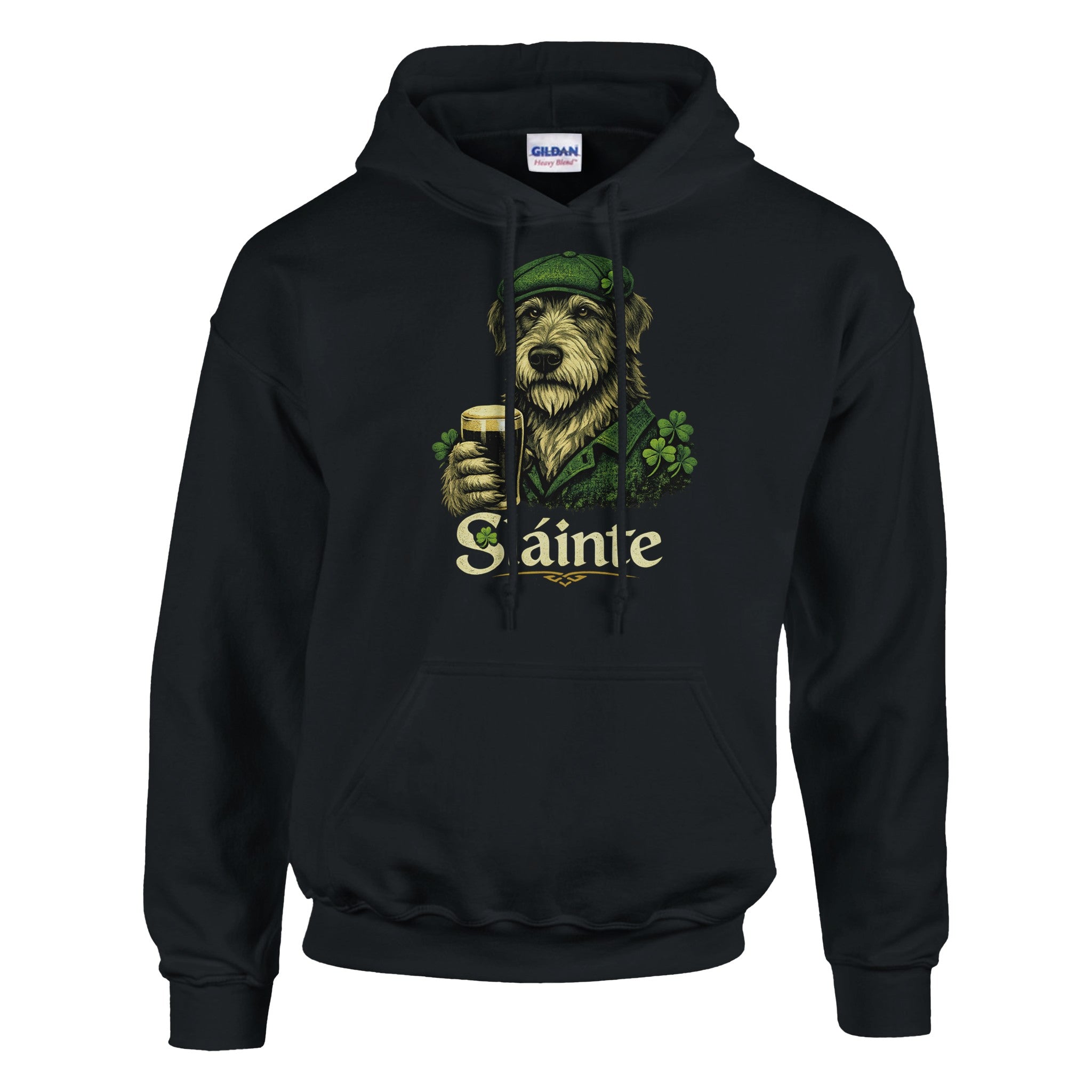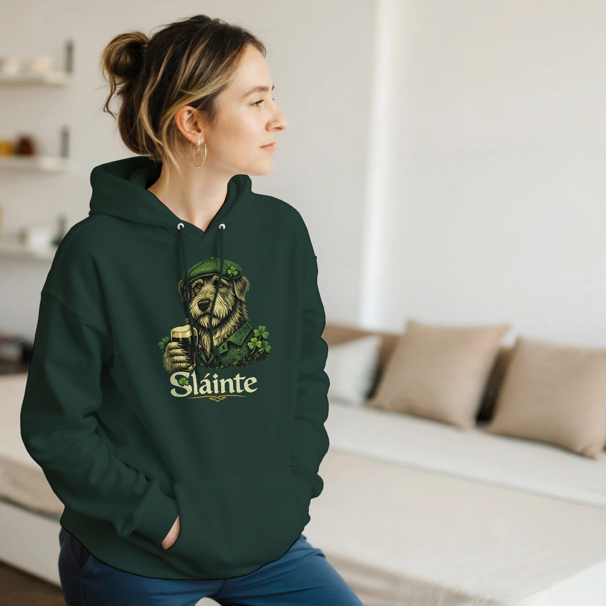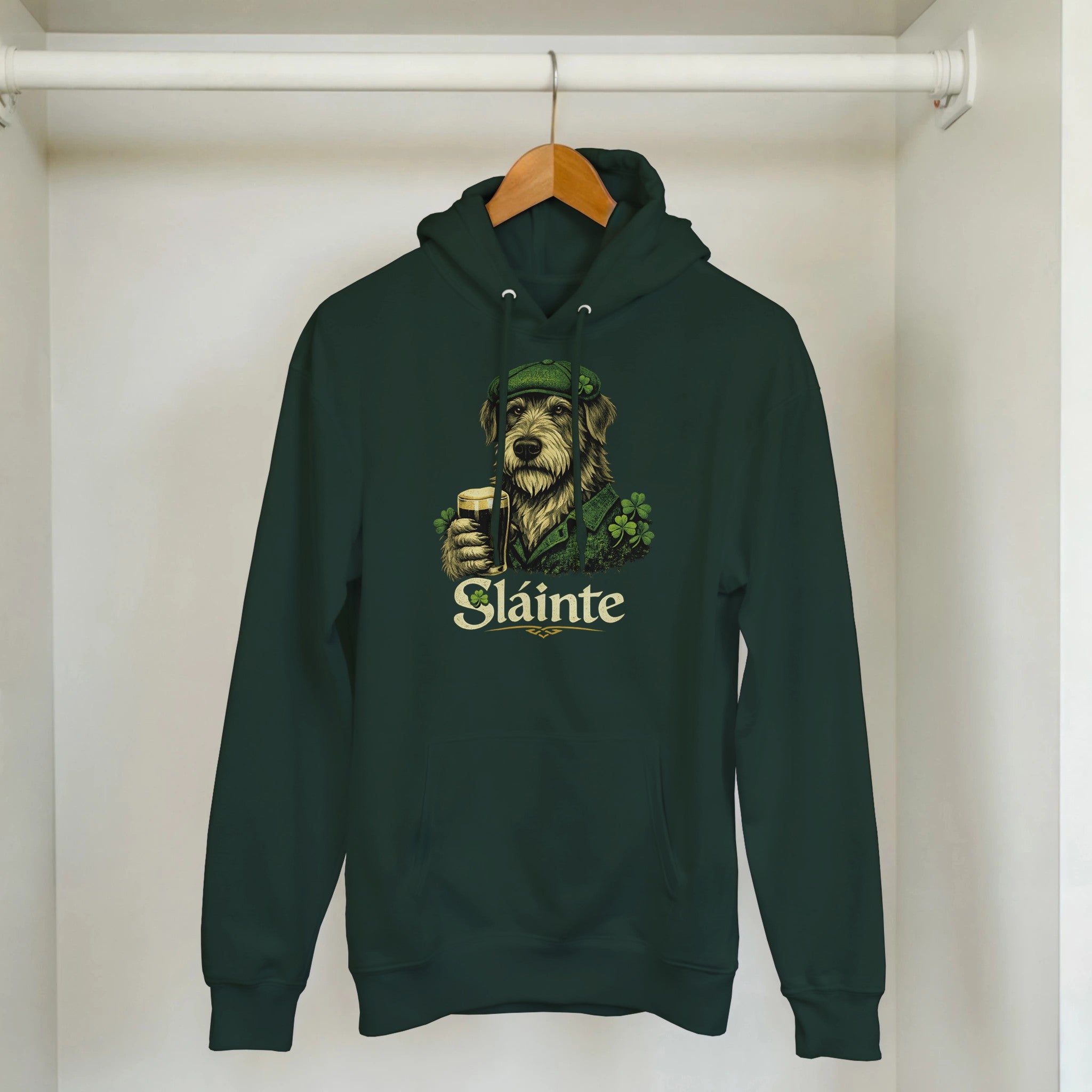 Irish-themed hoodie featuring a noble Irish Wolfhound in a green cap holding a creamy pint, finished with the word “Sláinte” beneath. A timeless Irish pub-style design celebrating heritage, humour, and St Patrick’s Day spirit.