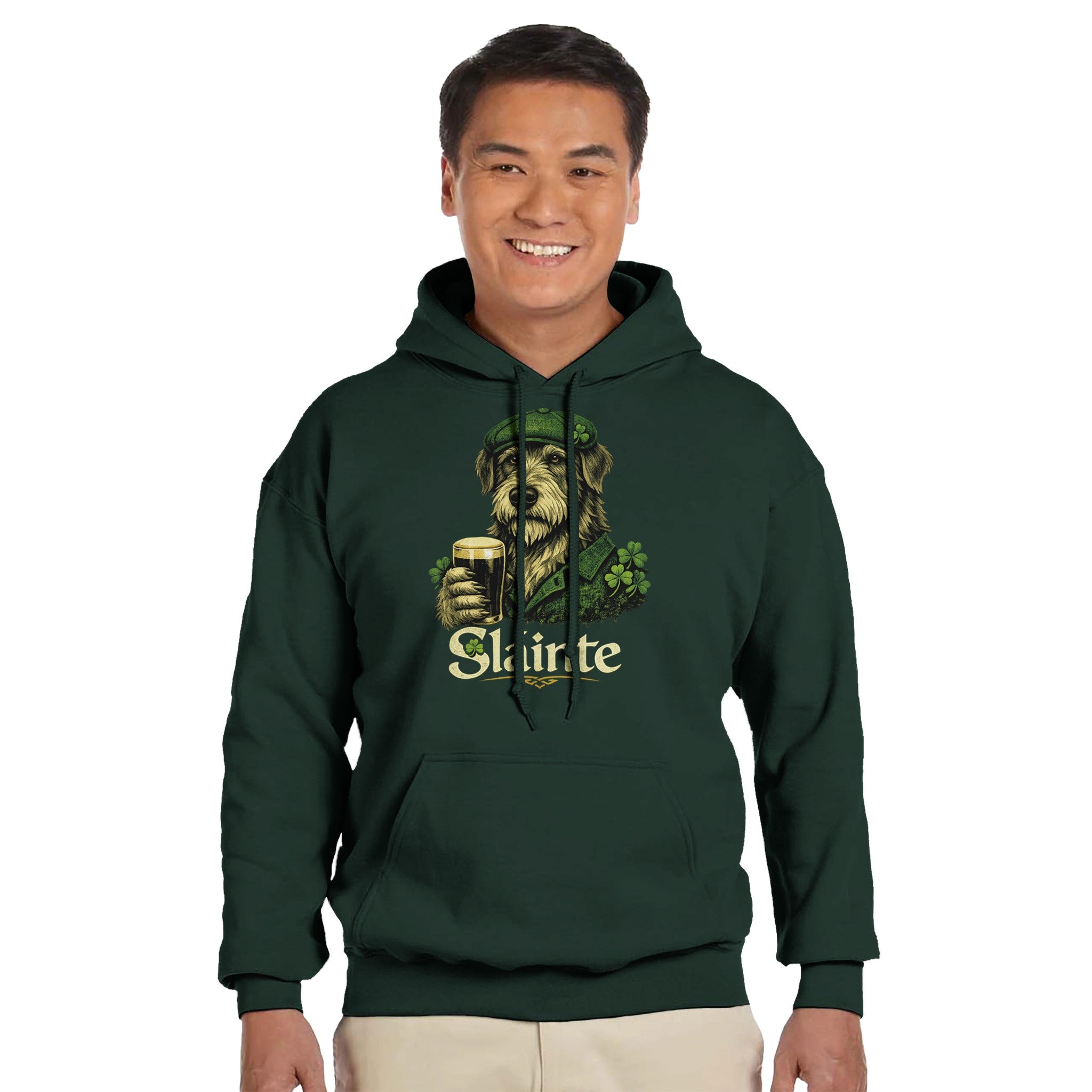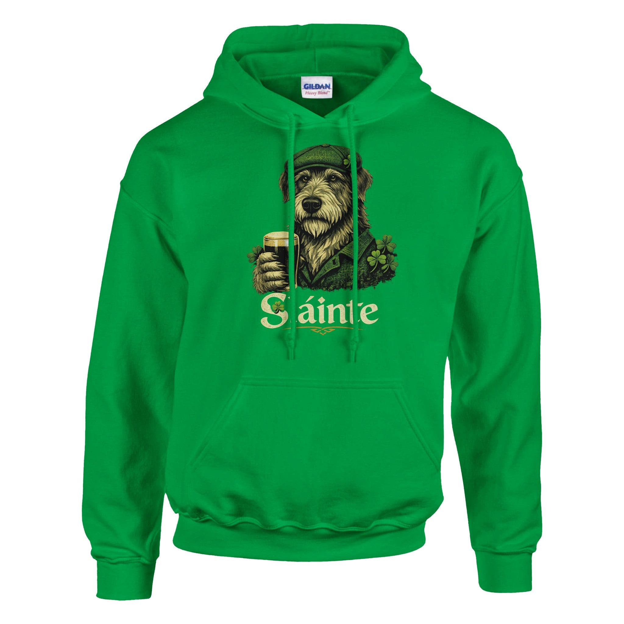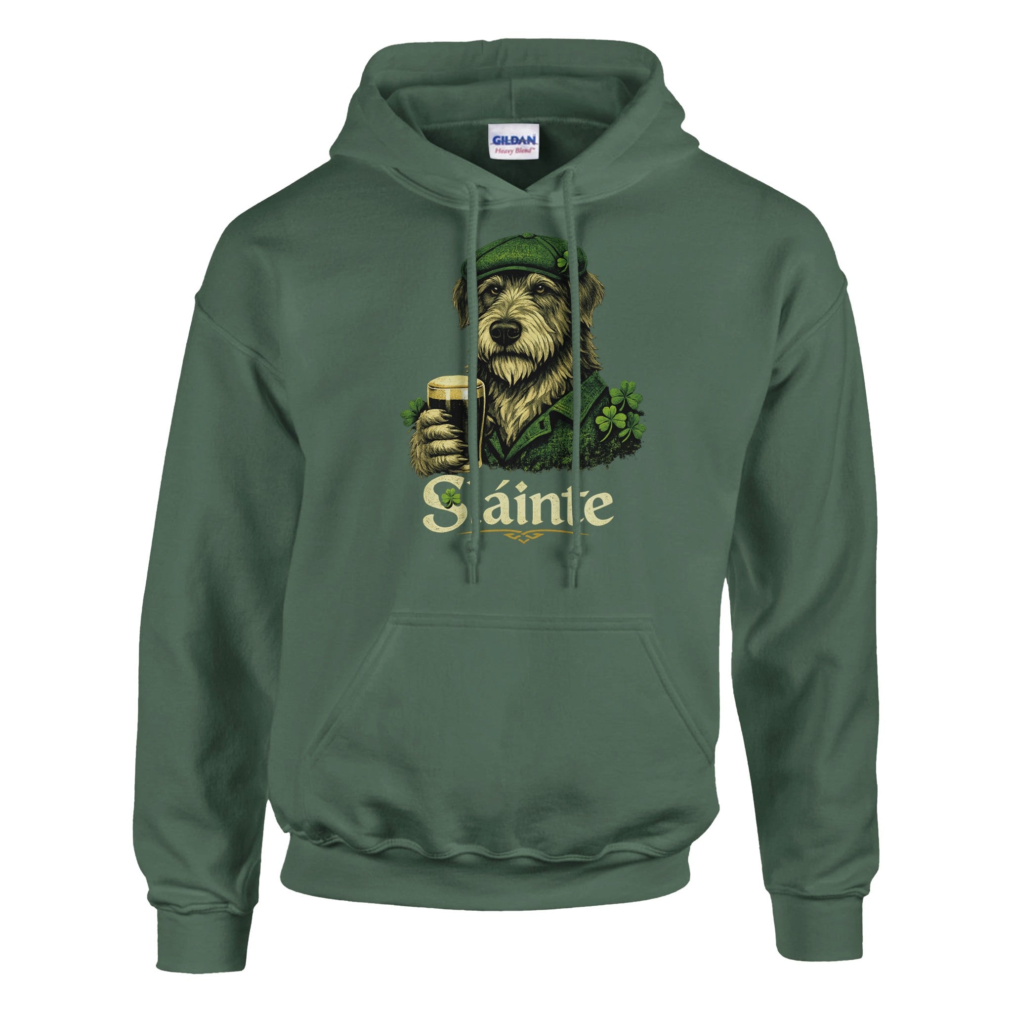 Irish-themed hoodie featuring a noble Irish Wolfhound in a green cap holding a creamy pint, finished with the word “Sláinte” beneath. A timeless Irish pub-style design celebrating heritage, humour, and St Patrick’s Day spirit.