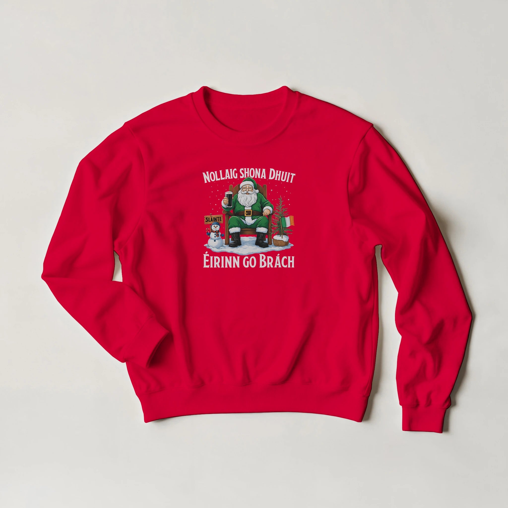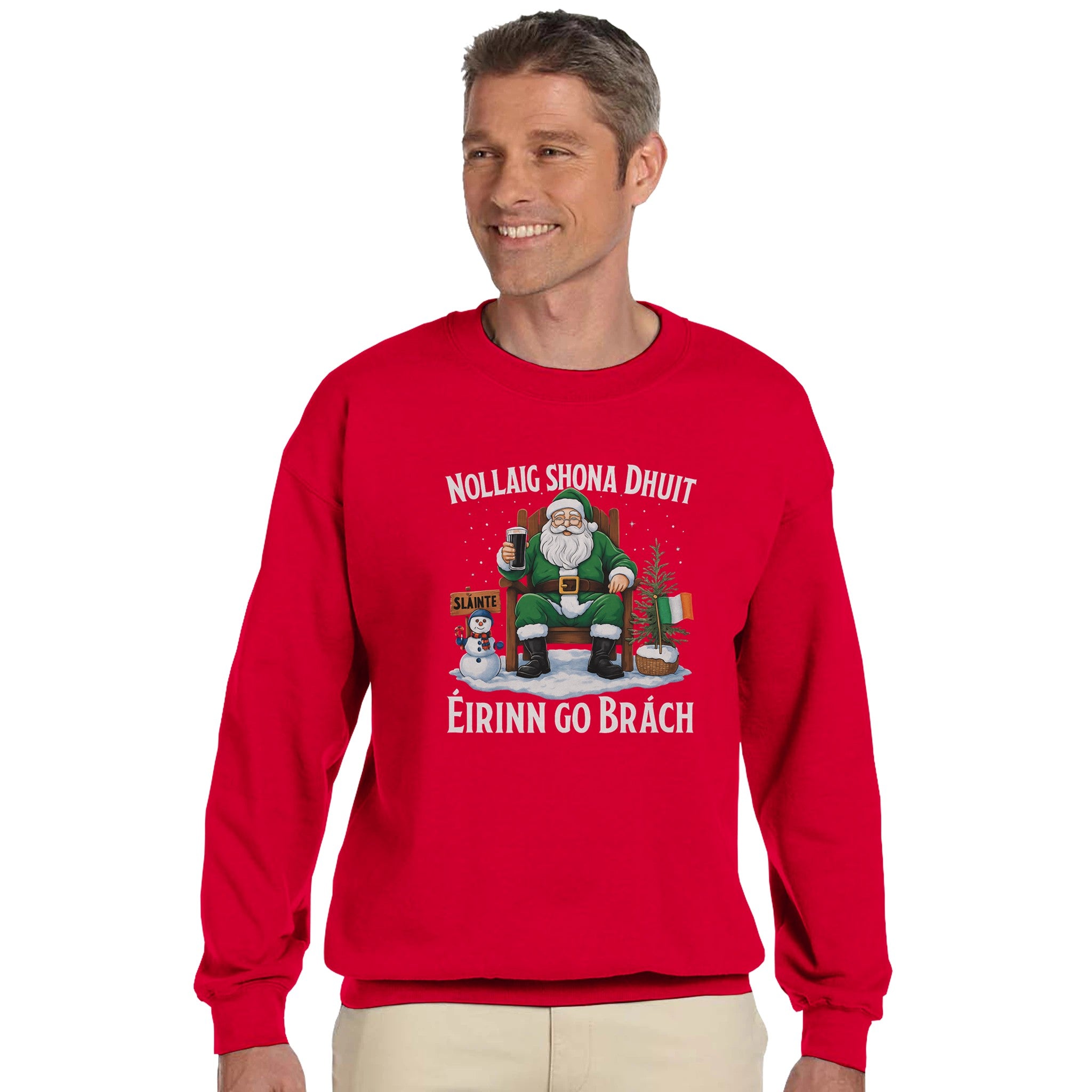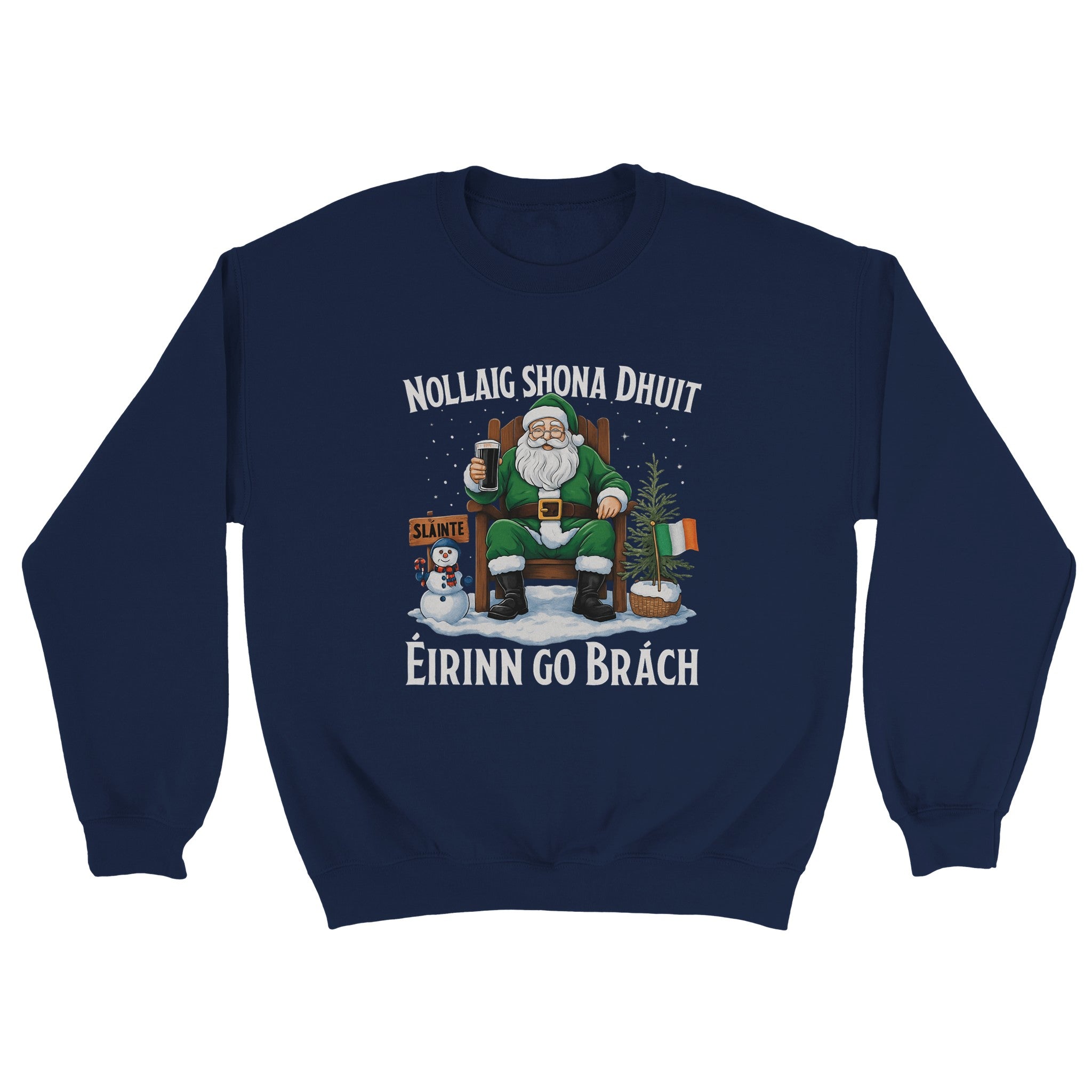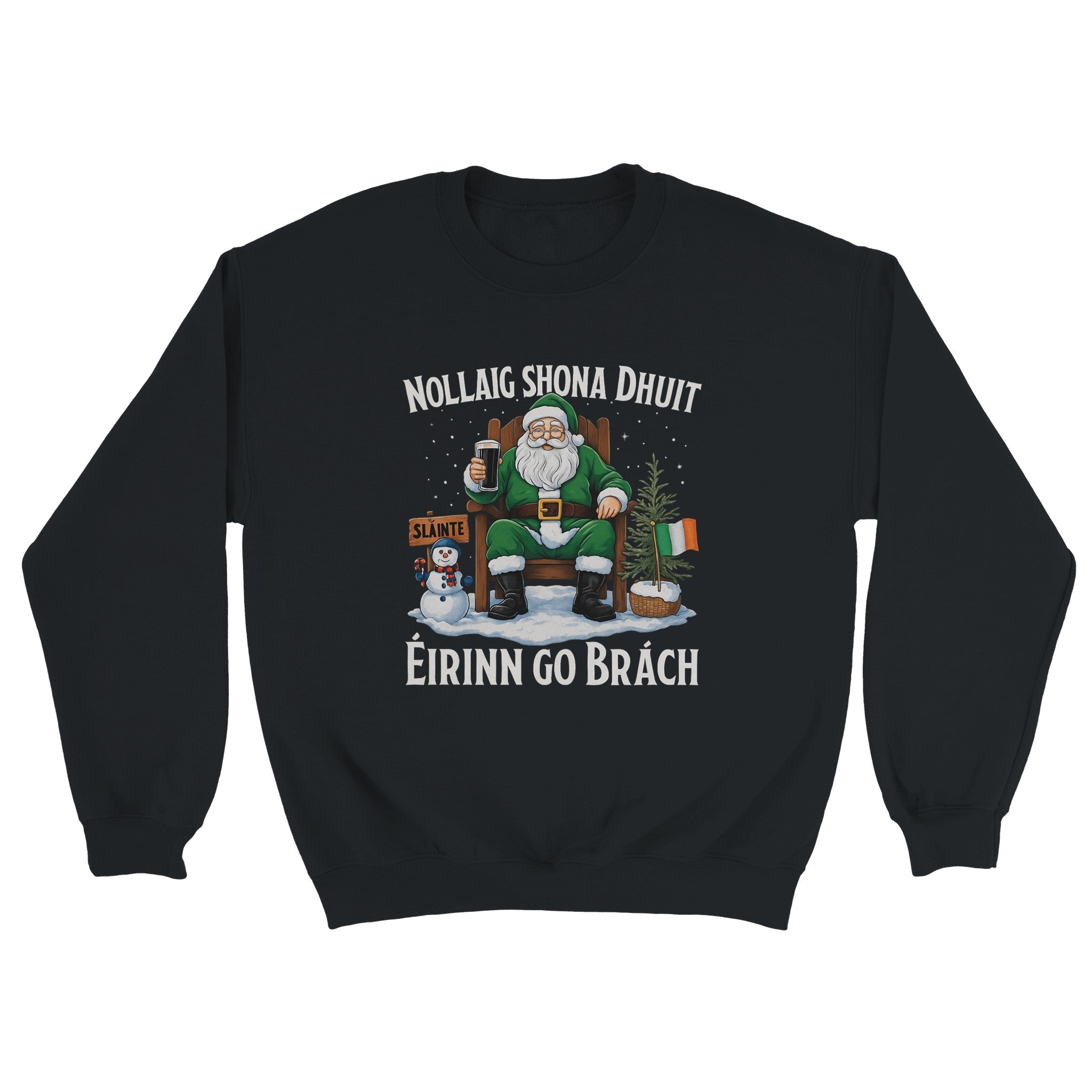 Celebrate Christmas with Irish pride in this Nollaig Shona Dhuit Éirinn go Brách sweatshirt! Featuring Santa in green with a pint, a snowman, Irish flags, and a “Sláinte” sign, this cozy unisex fleece-lined sweatshirt brings warmth, comfort, and festive Irish charm to your holiday season.