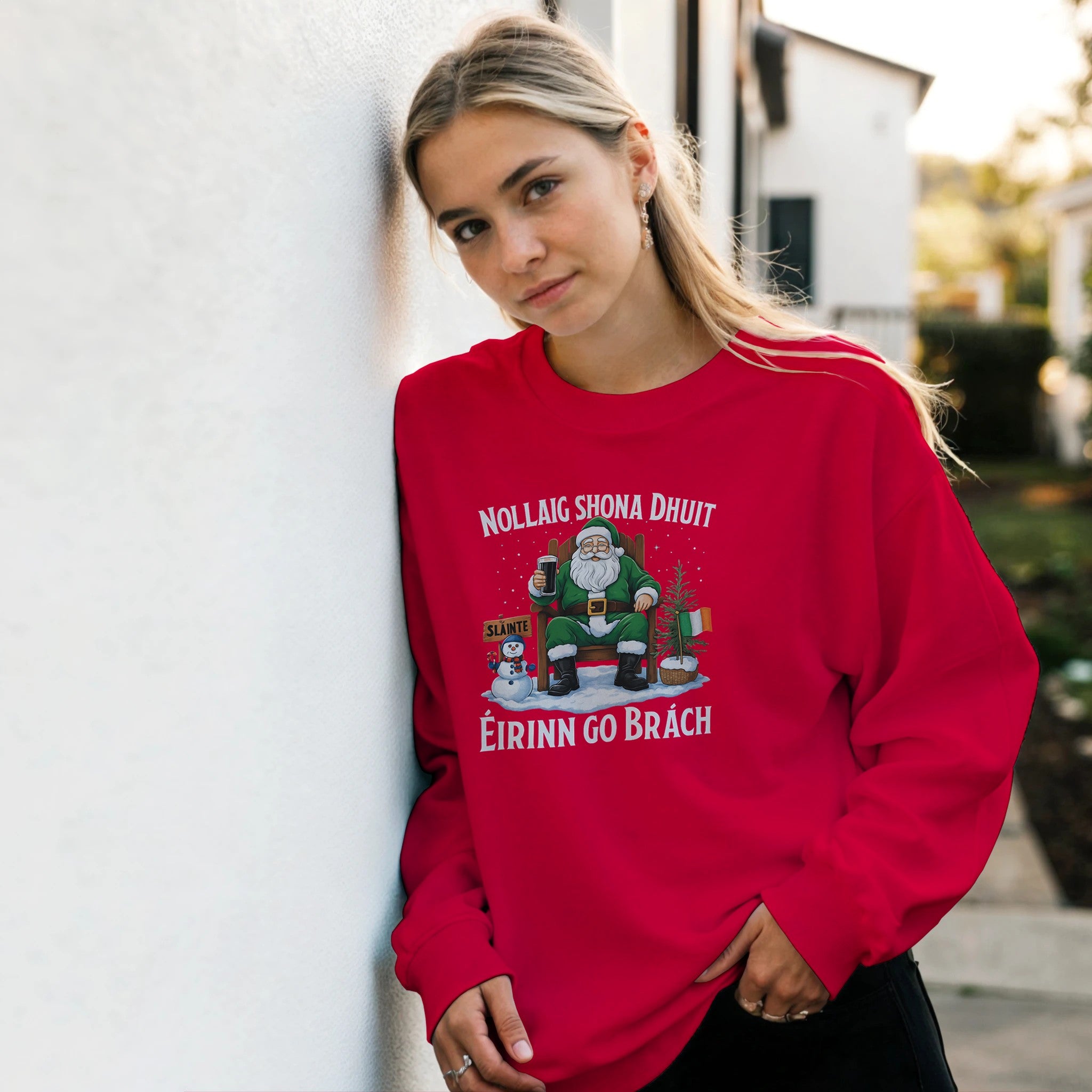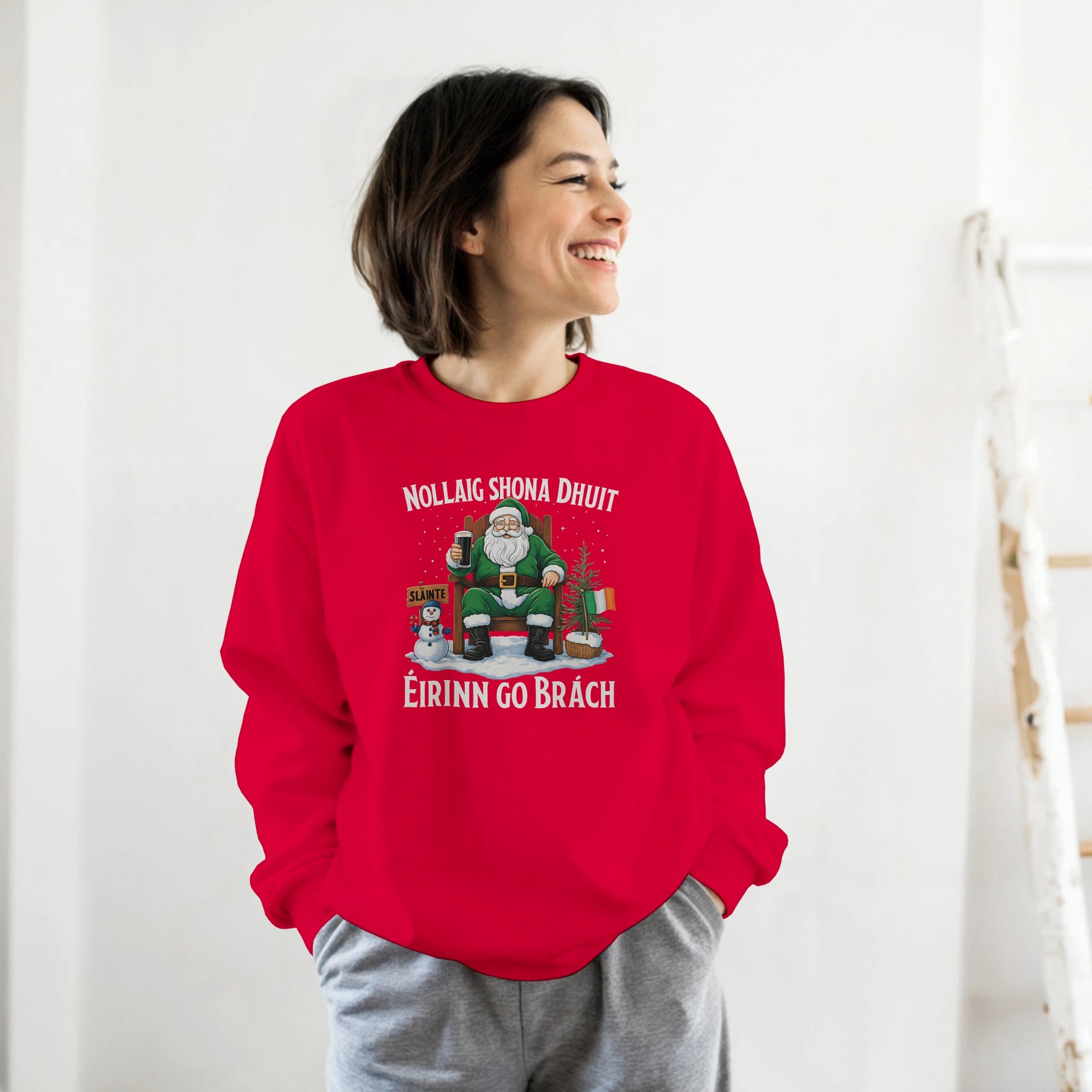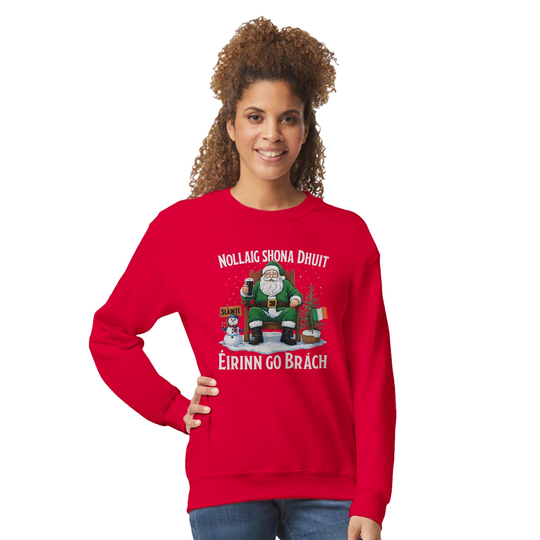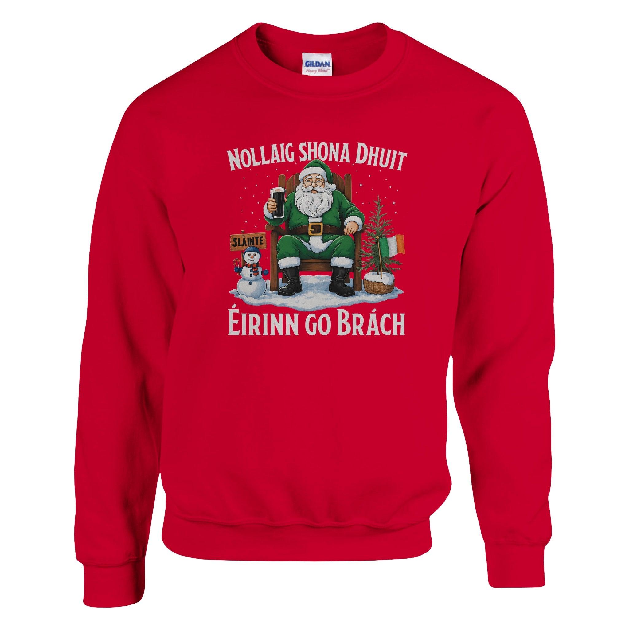 Celebrate Christmas with Irish pride in this Nollaig Shona Dhuit Éirinn go Brách sweatshirt! Featuring Santa in green with a pint, a snowman, Irish flags, and a “Sláinte” sign, this cozy unisex fleece-lined sweatshirt brings warmth, comfort, and festive Irish charm to your holiday season.